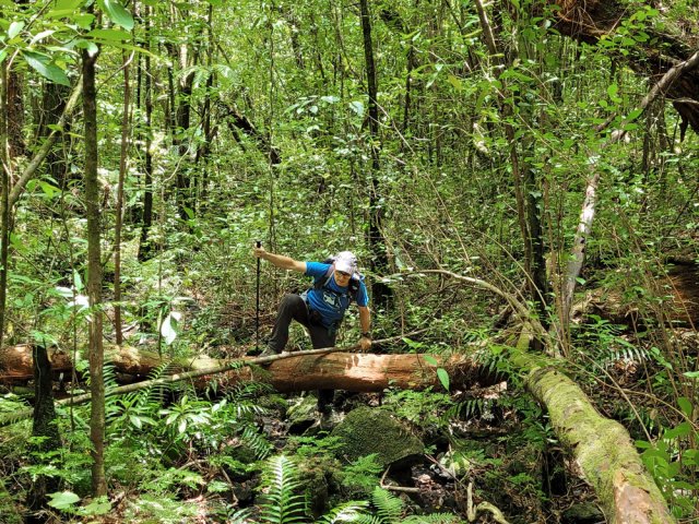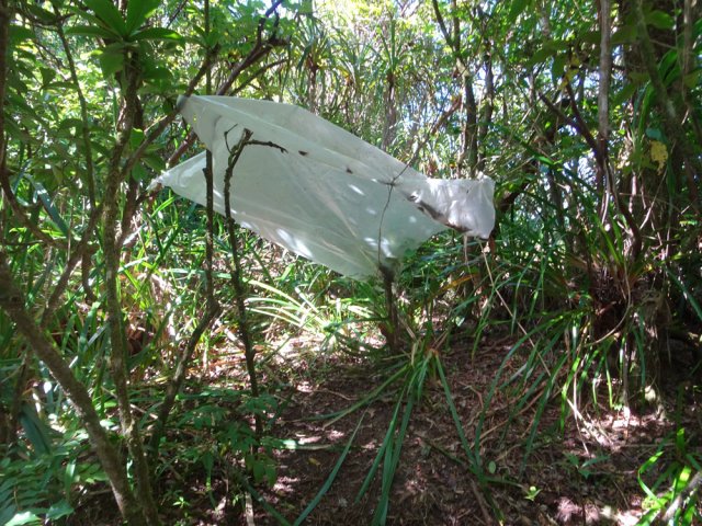 La randonnée débute au plus près de la route des Radiers par une discrète trouée dans la végétation constituée en partie de goyaviers (Photo 1). C'est parti pour 3300 m de montée constante à travers bois de couleurs et goyaviers sur les 300 premiers mètres (Photo 2). Tout au long de la montée, le sentier restera toujours visible et le sous-bois clairsemé et aéré (Photo 3). Les amateurs de beaux arbres seront gâtés même si l'on rencontrera toujours les mêmes espèces (bois maigres, de rempart, nattes, tans rouges, mahots, etc. - Photo 4). Les arbres de grande taille sont nombreux mais rares sont ceux qui ont été terrassés par les cyclones (Photo 5). Le sentier emprunte souvent de minuscules fonds de rus créés par les écoulements. Il est même possible de les confondre par endroits (Photo 6). Durant la montée, on emprunte un tronçon dans un fond de petite ravine. On semble perdre le sentier mais il est simplement barré par un arbre couché qu'il faut enjamber avant de retrouver la trace (Photo 7). Trente minutes après le départ, on se rapproche du rempart. La végétation très touffue n'empêche pas totalement d'apercevoir la Rivière de l'Est coulant dans son étroite vallée (Photo 8). La suite de la montée s'effectue assez près de ce rempart sans pour cela profiter de panoramas. Les ravines sont rares et souvent peu profondes excepté l'une d'entre elles qu'on longe un moment (Photo 9). Les goyaviers ont disparu depuis longtemps et le cheminement est toujours aisé entre les bois de couleurs et les pimpins de plus en plus nombreux (Photo 10). La zone assez pluvieuse de la côte Est favorise la poussée de mousses du sol jusqu'au sommet de la canopée (Photo 11). Même si le passage comporte quelques petites plantes ou fougères, le sentier est toujours visible (Photo 12). Il vaut mieux ne pas le perdre de vue mais dans ce cas, le sous-bois est si clairsemé qu'on retrouve facilement la trace surtout si l'on repère de loin la bouteille vide d'une boisson gazeuse. Pas de balisage hormis ces tristes détritus et quelques traces de coupe-coupe sur les écorces. La pente est régulière et sans grandes difficultés (Photo 13). Ce sont les pandanus qui créent le plus de verdure au plus près du sol (Photo 14). Les rares passages plus pentus se franchissent sur des racines ou des pierres moussues sur une trace qui a relativement bien vieilli (Photo 15). Une heure après le départ, on marche à nouveau au plus près du rempart pour quelques petites fenêtre végétales sur la rivière (Photo 16). Le sol y est en général assez plat et le cheminement s'effectue sans fatigue même si la marche est moins rapide que sur un GRR (Photo 17). Il faut traverser à gué une ravine plus importante que les autres comportant marmites, fissures et roches moussues assez glissantes (Photo 19). En la descendant sur une vingtaine de mètres, on domine à nouveau la Rivière de l'Est proche d'un cassé dangereux entouré de superbes arbres (Photo 20). Un peu plus loin, le sentier oblique sur la droite après un arbre couché formant deux arches moussues (Photo 21). La petite ravine suivante est la plus belle de la sortie ; une exploration ne prend que peu de temps pour profiter des beautés de la nature (Photo 22). Le fond se parcourt sans danger à la recherche de bassins ou de très belles racines (Photo 23). Plus on monte et plus le sentier se rétrécit, demandant un peu plus d'attention (Photo 24). A 900 m, l'emplacement d'un abri de fortune est l'endroit idéal pour la pause casse-croûte à deux pas du rempart (Photo 26). La vallée est toute proche mais il est très difficile d'en apercevoir le fond en raison de l'importante végétation (Photo 27). Les derniers 100 m de montée deviennent de plus en plus difficiles car le sentier est devenu une trace braco et il peut être facile de s'égarer (Photo 28). Les 1000 m sont atteints et il faudrait prendre beaucoup de temps pour tenter de rejoindre le Sentier des Citernes sans certitude de retrouver des bribes de la trace historique. Le demi-tour s'impose et le retour prend à peu près la même durée jusqu'au sentier Touzier.