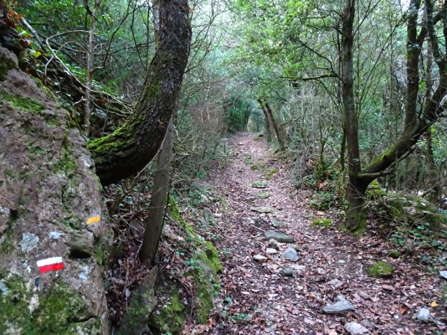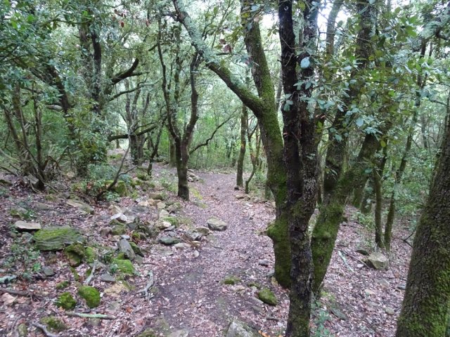 La randonnée débute au petit village de Termes sur l'un des parkings situés en début ou en fin d'agglomération. Plusieurs ruelles ou escaliers entre les habitations permettent de rejoindre le début de la boucle après avoir dépassé l'église (Photo 1). On réservera une dizaine de minutes à la fin de la boucle pour visiter le village. Dès la fin de la bourgade, le circuit pédestre débute par un large sentier caillouteux dans les garrigues. Il se poursuit à l'ombre de quelques arbres qui deviennent de plus en plus nombreux (Photo 2). On s'élève rapidement et le sentier tourne régulièrement vers la gauche. On domine souvent les collines environnantes dont celle abritant le château. Puis le parcours devient presque plat pour traverser la Serre de Coste Raste. Les panoramas sont constants jusqu'au petit sentier partant sur l'ouest pour rejoindre en une minute un point de vue dégagé sur la région (Photo 3). La descente débute peu après le point de vue. Le sentier en sous-bois traverse des zones anciennement habitées ou cultivées comme le montrent les murets encore debout (Photo 4). La forêt de jeunes chênes a tout envahi. Les sangliers défoncent de grandes surfaces des sous-bois et même le sentier. La descente s'intensifie sur un sol plus sableux comportant parfois quelques lacets (Photo 5). La pente disparaît presque par moment et le cheminement s'effectue à l'ombre des nombreux chênes (Photo 6). On frôle plus loin une ruine qui menace de tomber. On devine bientôt la route de Termes et l'on aperçoit le moulin de la Buade en rive droite du Sou. La zone ayant été exploitée au siècle précédent, les sentiers sont presque des pistes bordées de murets (Photo 7). De hautes falaises se dessinent devant à l'emplacement des Gorges de Terminet qui approchent. Au premier croisement, partir à gauche puis passer devant un dispositif de pompage entouré de grillage. On entend très bien le bruit d'une chute que l'on aperçoit à travers les arbres. On vient d'arriver au Sou et aux gorges. Câbles, mains courantes et barreaux fixés dans la roche permettent de descendre au plus près de l'eau en amont de la cascade. Les gorges s'admirent vers la gauche. Si le sol est sec, la remontée est aisée pour admirer bassins et petites chutes en longeant le cours d'eau à l'instinct (Photo 8). Faire demi tour, rejoindre le passage protégé et entamer une descente assez sportive pour rejoindre le bassin alimenté par la chute repérée en arrivant au Sou (Photo 9). A partir de la cascade, le but consiste à rejoindre la route et les tunnels dominant les gorges. Des sentiers et pistes partent dans plusieurs directions tant en rive droite qu'en rive gauche. Cette trace prévoit de traverser à gué le Sou près d'un bassin puis d'entamer directement la forte montée menant à la route (Photo 10). Plusieurs sentiers sans doute utilisés par les pêcheurs ou canyonistes rejoignent la RD40. Avant de partir à droite vers les ruines du château, marcher vers le village et passer au moins les deux tunnels (Photo 11). On domine les gorges et l'on aperçoit la cascade et d’autres petites chutes après le petit tunnel. Des sentes plus ou moins difficiles filent vers le fond des gorges constituées de plissement des couches de calcaire (Photo 12). Après cette visite intéressante mais facultative, revenir sur ses pas et emprunter la première piste sur la gauche. Très vite, on rencontre le sentier grimpant en pente douce sous les chênes en direction du château (Photo 13). Au prochain croisement, prendre à gauche et remonter vers le château par la piste caillouteuse ou par le sentier Nature. Les ruines dominent la région qu'on peut observer de toutes parts (Photo 14). On aperçoit le village de Termes qu'on rejoindra bientôt (Photo 15). Il est possible de suivre le parcours de visite lorsque le château est ouvert. On passe de ruine en ruine en devinant l'usage des bâtiments ou en lisant les panneaux indiquant leur fonction. Redescendre après cette balade avec panoramas à 360° et rejoindre la route. La deuxième boucle peut débuter. Pour cela il est possible de continuer sur la piste de droite ou de la rejoindre en passant par le village. Dans ce cas, partir à gauche et marcher jusqu'à la fontaine de marbre gris. Tourner à droite entre des bâtiments, longer une clôture puis un sentier agréable en sous-bois (Photo 16). On rejoint après quelques montées la piste menant au château. Partir à gauche et entamer une jonction très facile sur pistes en direction de la ferme isolée des Courtives (Photo 17). Après les prairies et bâtiments de ferme, poursuivre sur un agréable sentier, toujours en sous-bois de chênes, comme depuis le début de la journée (Photo 18). On parvient assez vite malgré la distance aux premières falaises de Nitable Roc bien connues des grimpeurs de la région (Photo 19). Le sentier, très rocheux, longe tout d'abord les rochers puis effectue de fortes descentes sur hautes marches (Photo 20). La pente se calme dans les bois que l'on retrouve avec de beaux spécimens de chênes centenaires. Plus bas, on devine les Gorges de Caune Pont (Coynepont) dominées par une imposante barre rocheuse (Photo 21). Un gros trou de trente mètres sur la gauche attire l'attention. Il s'agit d'un effondrement important ayant donné naissance au grand pont naturel de Caune sur lequel passe le GR (Photo 22). Un sentier partant vers les gorges dans les rochers peut s'avérer vertigineux pour certains marcheurs (Photo 23). Laisser cet endroit rocheux de Fenne Prenz et entamer la longue descente menant aux prairies qu'on aperçoit depuis le sentier en lacets très rocailleux (Photo 24). On retrouve une dernière descente en sous-bois bordée de genévriers centenaires, morts ou vivants (Photo 25). On se retrouve sur la rive gauche du Sou. De l'autre côté, quelques fermettes et prairies sont encore exploitées. La rivière comporte souvent de petits barrages na