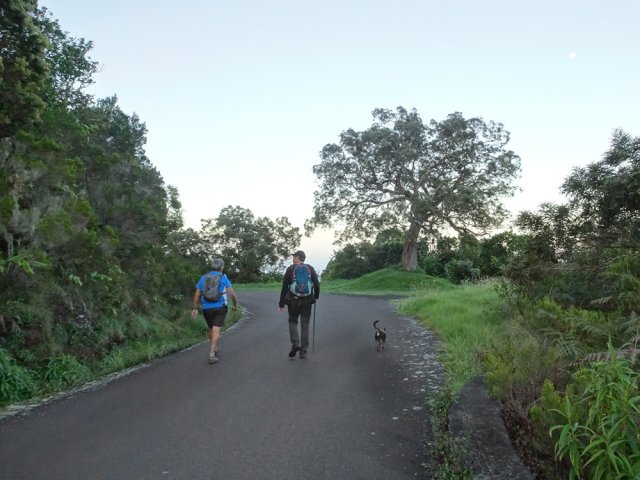 La randonnée débute au parking situé à la fin de la RF des Cryptomerias d'où partent de nombreux circuits vers les forêts, rempart ou Îlet Alcipe. Revenir vers la route du Maïdo pour emprunter l'ancien sentier Lebreton ou le raccourci que l'on peut emprunter dans un virage de la route, en face d'un tamarin esseulé (Photo 1). Les deux premiers kilomètres sont très faciles à décrire : piste en pente régulière, glissante, marquée en deux parties par les milliers de passages de pneus de VTT (Photo 2). Les 300 m de montée s'effectuent en cherchant toujours le meilleur passage le moins glissant. Les abords du large passage sont couverts de longoses et parfois de vigne marronne. Les derniers hectomètres sont plus agréables avec un sol moins creusé et recouvert d'herbe rase (Photo 3). On parvient en moins de 40 minutes à des travaux pour la construction d'une réserve d'eau. La fin de la route Oméga, d'ordinaire agréable, est désormais bordée de tous les monticules de terre ayant permis le creusement de la réserve. En quelques mois, ces talus artificiels seront heureusement recouverts de verdure. Dans le premier lacet rencontré, à la fin du Sentier de Cambour, chercher à quelques pas du panneau de l'ONF la trace discrète remontant vers l'est dans les longoses et bringeliers (Photo 4). La sente est peu fréquentée mais se perd difficilement des yeux malgré quelques fougères (Photo 5). La pente y est parfois forte mais il en est ainsi des sentiers de raccourci qui font gagner des hectomètres mais peuvent faire monter le palpitant (Photo 6). Le parcours s'éloigne d'une petite ravine profonde et arrive bientôt au lacet suivant de la route forestière. L'emprunter sur 200 m et repérer, à deux pas du poteau du Parc National, le nouveau sentier en direction du rempart qui pénètre sous les tamarins des hauts (Photo 7). Il est plus large, plus facile, moins envahi que le précédent et accueille de beaux arbres (Photo 8). Il se termine au sentier du Rempart de Mafate en direction du Maïdo ou de l'Îlet Alcipe, à une vingtaine de mètres du rempart. La végétation cache les points de vue sur le cirque. Partir à gauche sur ce très agréable sentier bordé de tamarins (Photo 9). Il se rapproche du vide pour de premières vues en direction du Grand Bénare (Photo 10). Il n'est pas totalement plat et effectue parfois des montées et descentes sans grande difficulté à travers une végétation constituée essentiellement de tamarins (Photo 11). Beaucoup ont souffert du passage de Batsirai en 2022 mais rares sont ceux qui ne survivront pas (Photo 12). Le sentier se poursuit dans les herbes et sous les tamarins à quelques mètres du vide (Photo 13). Les points de vue se multiplient sur l'ensemble du cirque pour des panoramas n'ayant rien à envier à ceux du Piton des Orangers ou du Maïdo (Photo 14). On domine les trois îlets des Orangers qu'on peut observer à loisir. Puis le sentier s'éloigne petit à petit du bord et pénètre dans la Réserve Biologique des Hauts de Bois de Nèfles. C'est une réserve biologique dont le but n'est pas de préserver les longoses qui recouvrent la totalité du sol (Photo 15). Heureusement, on rencontre à tout instant de magnifiques arbres méritant le respect et même une halte (Photo 16). La marche est toujours aisée, en légère descente (Photo 18). On bénéficie de nouveaux panoramas en direction du Cap Noir, de Dos d'Ane et de la côte près d'un majestueux tamarin (Photo 19). Le sentier domine le plateau de l'Îlet Alcipe. On distingue très bien l'emplacement de l'îlet envahi par la végétation et tous les pitons alentour (Photo 20). Prendre à gauche le sentier de Cambour, également fréquenté et en très bon état (Photo 21). Il effectue constamment des montées et descentes qui ne suffisent pas à couper les jambes (Photo 22). Délaisser ce sentier pour partir à la première bifurcation vers la RF des Cryptomerias. Le sentier est identique au précédent, peut-être un peu plus envahi de racines. On ne tarde pas à frôler le Roi des Tamarins qui, malgré une branche cassée, résiste plus facilement aux cyclones que ses congénères en bord de rempart (Photo 23). Le sentier, large et propre, passe au milieu de superbes bois de couleurs (Photo 24). Aucun espace n'est délaissé par les longoses qu'on ne quittera plus jusqu'au véhicule (Photo 25). Il faut encore franchir de nombreuses ravines plus ou moins encaissées pour de nouvelles montées et descentes. Certaines ont le fond plus rocheux que d'autres et peuvent même être glissantes (Photo 26). Après avoir franchi la plus importante d'entre elles, la Ravine la Plaine, la descente se poursuit avec les mêmes paysages de beaux arbres et de longoses (Photo 27). On ne tarde pas à rejoindre une table de pique-nique et le départ de nouveaux sentiers à la fin de la Route Forestière des Cryptomerias. Poursuivre à gauche sous les grands conifères puis rejoindre le rond-point servant de parking, fin de cette boucle de 10 km (Photo 28).