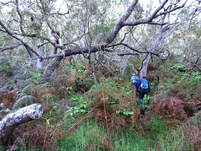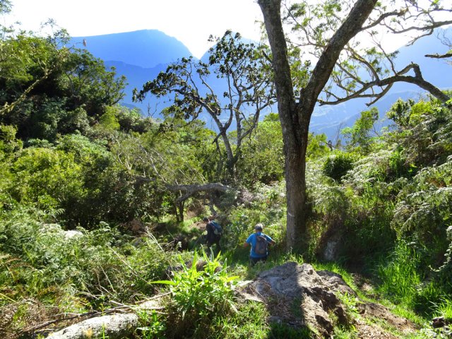 La boucle, dans le Bois de Sans Souci et la réserve Biologique des Hauts de Bois de Nèfles, emprunte certains sentiers déjà publiés sur le site. Cette boucle, à l'initiative de Marc, présente dans sa partie sud l'Ancien Sentier Lebreton, une piste connue des vététistes ainsi qu'un sentier étroit mais bien commode pour couper les longs lacets de la Route Forestière Oméga. Le cheminement s'effectue à moins de 200 m du Sentier Françoise Francia mais la forêt, le sol et l'attrait en général sont très différents. La boucle perd un cœur en raison de cette piste qui, heureusement s'effectue en début de boucle. La sommière Cresson a depuis longtemps disparu mais un sentier demeure entre les lacets ou le rempart pour grimper de manière rectiligne vers les superbes points de vue sur Mafate à la verticale des îlets des Orangers. Une manière de varier les façons de rejoindre l'Îlet Alcipe non prévu sur cette fiche. La montée effectuée, ce n'est que pur plaisir de marcher en bordure de rempart pour bénéficier de splendides panoramas si l'on a pris soin de partir assez tôt. Plus bas, ce seront d'immenses étendues de forêts de bois de couleurs, hélas totalement envahies de longoses. Quelques spécimens d'arbres (bois maigres, tans rouges, mahots, change écorce et bien évidemment tamarins des hauts) méritent fréquemment une petite halte pour les admirer. Comme la randonnée ne fait qu'une dizaine de km, ne pas hésiter à effectuer la courte boucle vers l'Îlet Alcipe qui prendra moins d'une heure et permettra de profiter de nouveaux points de vue sur Dos d'Ane et le Cap Noir.