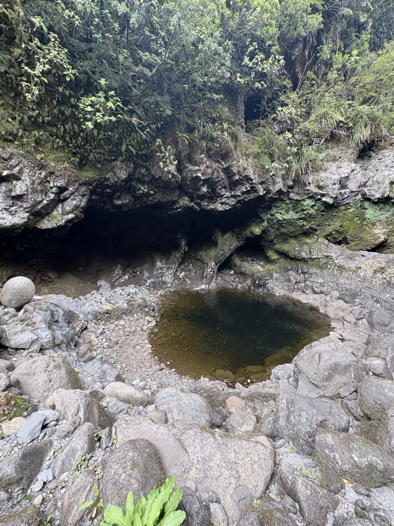 La randonnée débute sur la route de Bélouve, à l'emplacement de parking juste avant la Piste Forestière de Takamaka. Comme elle est fermée d'une barrière, il faut donc entreprendre la longue descente prenant environ 45 minutes. Ce sera un peu plus long au retour en raison de la pente. Aucune difficulté pour suivre ce large chemin au milieu de la forêt de Bébour, riche en espèces végétales. Le cheminement alterne parties plates avec bandes de roulement, portions bétonnées et d'autres où subsistent quelques ornières (Photo 1). Plus on descend et plus on s'approche du Plateau du Mazerin qui domine toute la région (Photo 2). Les bois de couleurs sont envahis de hauts fanjans plus ou moins rabougris en fonction de la saison. A la rencontre du sentier de Takamaka, ne pas hésiter à pousser un peu d'une centaine de mètres jusqu'aux installations du téléphérique desservant le barrage situé au fond de la vallée de la Rivière des Marsouins. Un coup d'œil sur la vallée permet de l'apercevoir ainsi que le Plateau Duvernay de l'autre côté (Photo 3). Remonter un peu et partir vers Takamaka par le sentier de droite. Le poteau de l'ONF confirme la destination. Prendre à gauche pour suivre l'étroit mais agréable sentier de Takamaka (Photo 4). Attention, ce sentier n'est emprunté que sur une centaine de mètres. Repérer, sur la droite, un départ de sentier beaucoup plus étroit que le précédent. Il reste cependant visible et se suit facilement jusqu'à la Ravine Misère qu'on a repérée à droite avant de tourner puis de descendre (Photo 5). La ravine se traverse aisément en repartant de quelques mètres vers l'amont. Le fond est constitué de cavités très agréables si elles sont en eau. On devine sur la droite un grand bassin qu'il est possible d'approcher. La partie sportive débute à la Ravine Misère. Le sentier permettant de quitter le lit grimpe, quasi verticalement, à travers la végétation. Des arbres abattus, humides, très glissants sont les seuls moyens de se retenir et l'obstacle coupe un peu le souffle (Photo 6). La suite de la traversée jusqu'au rempart comportera encore quelques pentes mais plus faibles et très courtes (Photo 7). Plusieurs embranchements, plus ou moins marqués, peuvent désorienter ou poser questionnement. Le GPS s'avère donc utile à moins d'avoir un bon sens de l'orientation et deviner la direction du rempart. La végétation est très fournie en bois de toutes espèces, difficiles à reconnaître en raison de la mousse épaisse recouvrant les troncs. Le cheminement est rarement droit puisqu'il faut slalomer entre les arbres vivants ou couchés, fanjans, pimpins ou palmistes au tronc piquant (Photo 8). Compter près de 45 minutes pour effectuer ce petit kilomètre inoubliable par sa végétation. L'apparition de la lumière indique qu'on vient d'atteindre le bord du rempart, au seul endroit prévu pour le descendre (Photo 9). La partie plate est terminée et les mains peuvent sortir des poches. La plongée est immédiate dans les pailles sabres sur une trace à peine visible. Les points de vue sur la vallée qu'on cherche à atteindre sont rares entre les branches de mapous, bois de tambour ou magnifiques tans rouges (Photo 10). La pente et la qualité du sol empêchent d'ailleurs de s'intéresser aux panoramas. Il faut constamment chercher la racine, la branche ou la marche pour s'assurer dans une pente frisant souvent les 80° (Photo 11). Heureusement, cette descente est très courte et l'on peut, 10 minutes plus tard, rincer les chaussures dans le Bras Patience dans un premier petit bassin. Partir vers l'aval pour la visite du tronçon le plus court mais le plus riche en curiosités (Photo 12). La marche ne surprendra pas les habitués des fonds de ravines. L'absence de cyclone laisse le fond recouvert de renouées teignant en rose tout le fond du cours d'eau (Photo 13). Le sol peut être couvert de cailloux, de rochers ou de plaques basaltiques usées par les crues (Photo 14). Difficile à repérer derrière un éperon rocheux en rive droite, une modeste arche minérale peut s'atteindre rapidement. A quelques dizaines de mètres en aval, un profond bassin d'eau paraissant sombre barre le passage (Photo 15). Ne pas quitter le lieu sans voir les superbes grottes en rive droite. Elles dominent le bassin mais se visitent sans danger (Photo 16). Repérer en rive gauche, quelques mètres en amont, le sentier des pêcheurs permettant d'atteindre le bassin sans grands efforts. D'ici, il paraît beaucoup moins sombre. On en distingue le fond plusieurs mètres sous la surface de l'eau aux tons turquoise (Photo 17). Une nouvelle grotte très vaste au plafond couvert de fougères peut donner l'occasion d'une halte ombragée (Photo 18). Quitter ce lieu magique et sauvage pour poursuivre jusqu'à une nouvelle cascade. Impossible de poursuivre après le gros rocher qui domine un vaste bassin 20 m plus bas (Photo 19). Ce bassin, en forme de cœur, présente lui aussi une eau claire et transparente (Photo 20). Pour se baigner, il faut avoir emporté 50 m de corde, mais ce n'est plus alors de la randonnée !!! Reprendre donc le chemin inverse en remontant à travers roches et renouées fleuries (Photo 21). Le lit ne varie guère. On retrouve les roches plus ou moins imposantes et les gros galets pouvant être instables ou humides (Photo 22). Un nouveau bassin d'eau claire apparaît dans la montée. Pour atteindre la petite cascade qui l'alimente, partir à nouveau en rive gauche à travers la végétation touffue sur une modeste trace (Photo 23). La baignade y est possible sans danger si l'eau n'est pas trop fraîche. Plus haut, ce sont de très courtes portions de petits canyons, de grosses roches à contourner, de restes de falaises dans le lit ou de jolies petites grottes creusées dans la rive par les courants (Photo 24). En fonction de la lumière, il y a moyen de régaler les amateurs de photos naturalistes (Photo 25). Les bassins