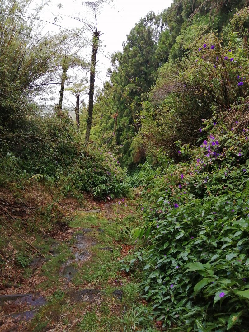 La randonnée est agréable mais par temps humide et après une nuit pluvieuse j’aurais peut-être dû faire la boucle dans l’autre sens. En effet la descente au bord de la forêt dans la ravine est vertigineuse: on glisse pas mal sur les racines ou les pierres, sans compter la boue