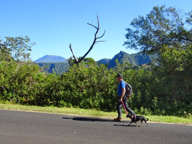 Marcher sur des routes ou pistes ne me dérange pas du moment qu'il n'y a pas de circulation, ce qui était le cas aujourd'hui (et doit l'être souvent car nous sommes sur des axes secondaires, voire tertiaires !). Et si en plus c'est presque plat, qu'il fait 15 à 17 degrés avec du soleil et une brise stimulante, et qu'on trouve des goyaviers à point, c'est encore mieux ! Les passages de ravine ne posent plus problème : pour ravine sèche l'accès a été nettoyé et on voit bien que ça part sur la gauche pour retomber sur la ruelle ; pour Grand bras Piton il y a un marquage rose.