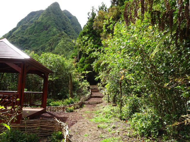 La randonnée débute ici derrière la mairie où de nombreux parkings permettent de laisser un véhicule à l'ombre des platanes. Rejoindre la Rue du Stade en visitant les jardins fleuris entourant la mairie et l'église composée de deux bâtiments distincts (Photo 1). On rejoint rapidement le stade et l'aire de pique-nique du Bassin Cadet où de courtes randonnées sont possibles. Franchir le radier de la Ravine Sèche et poursuivre en rencontrant de moins en moins d'habitations (Photo 2). Tourner à gauche au premier croisement puis continuer en longeant des prairies et en appréciant les panoramas sur les remparts de la Grande Montée (Photo 3). On est déjà en pleine nature avec très peu de circulation pour profiter sereinement de tous ces paysages. Plusieurs producteurs de goyaviers ouvrent leurs champs, à la saison, pour les cueilleurs munis de leur seau. Les arbustes, taillés et bas pour mieux se saisir des fruits n'ont rien à voir avec ceux rencontrés plus tard lors de cette randonnée (Photo 4). Plus loin, emprunter à droite la Rue des Remparts surtout marquée par les platanes qui jaunissent en juin et laissent au sol des couches de feuilles (Photo 5). La rue longe la Ravine Sèche qu'on devine par endroits. Pour revenir vers la ville et traverser le petit cours d'eau à sec, poursuivre et ne pas manquer le départ du sentier qui descend de manière abrupte vers les galets encombrant le lit. Traverser en visant la suite du sentier vers la gauche (Photo 6). Suivre, le Chemin Fifine bordé de bambous, une centaine de mètres de la D55 puis poursuivre tout droit sur la Rue Luc Boyer bordé de quelques habitations et champs en profitant cette fois des points de vue sur le Piton des Songes (Photo 7). Franchir la Ravine du Bras des Calumets et bifurquer à droite sur une agréable piste bordée de prairies (Photo 8). Le chemin n'est pas goudronné mais on y rencontre quelques cases fleuries (Photo 9). La pente s'intensifie au moment d'emprunter quelques lacets bordés de grosses touffes de vigne marronne (Photo 10). Le chemin, de plus en plus ombragé sous les cryptomerias finit à la RN3, près du parking du chemin de croix du Piton des Songes. On retrouve le goudron de la Rue Evan qui ne comporte pas de trottoirs, mais la circulation y est très faible. Comme depuis le départ, on marche surtout en regardant les jardins fleuris, les belles cases créoles et les contreforts du Piton des Cabris qu'on devine à l'horizon (Photo 11). Une série de lacets permet de s'élever un peu pour profiter de plus en plus de panoramas vers le Piton des Neiges ou le Pic des Sables (Photo 12). La montée sera constante jusqu'aux habitations de Bras Piton. On repère les cryptomerias entourant le Piton Doré cachant le départ vers le Piton Textor qu'on aperçoit à l'horizon (Photo 13). On arrive d'ailleurs rapidement à la zone de repos sous les conifères et profiter ainsi des tables de pique-nique pour la première halte. La descente débute par la Rue Bernard Ginet bordée par endroits de bosquets de thé. Les arbustes cultivés au siècle dernier et abandonnés constituent désormais de très hautes haies (Photo 14). Pousser jusqu'au pont sur la Ravine du Bras Piton pour y découvrir bassins et marmites mais poursuivre en obliquant à droite sur la Rue Viella qui mène, toujours dans la verdure, vers le départ du circuit vers le Piton des Cabris (Photo 15). Avant de pénétrer dans la forêt de cryptomerias, profiter des panoramas sur une grande partie des remparts entourant la Plaine des Palmistes (Photo 16). La piste descend légèrement pour franchir le Grand Bras Piton puis pénètre sous les grands conifères. La marche facile est ombragée la plupart du temps. La large piste est utilisée par les automobilistes qui stationnent en bout de piste (Photo 17). Laisser le sentier de droite vers le Piton des Cabris. Après le parking, poursuivre sur un escalier pénétrant dans le sous-bois et entamer la montée sur les racines en lisière de forêt (Photo 18). Après une courte descente pour franchir une passerelle sur la Ravine Fortuné, le sentier se met à plonger si fortement sur les racines que les mains s'avèrent utiles pour ralentir (Photo 19). On suit la Ravine Fortuné assez difficile d'accès puis on traverse un affluent humide dans les mousses (Photo 20). Très vite, le sentier débouche sur la piste venant du nord et une descente en plusieurs lacets débute dans la verdure et le silence (Photo 21). Un premier sentier débute sur la gauche. Il mène à une aire cultivée jadis pour y récolter le thé. La zone, désormais recouverte de végétation demandera beaucoup de travail pour la remettre en état (Photo 22). Plus bas, le sentier est à éviter car il se termine à une vingtaine de ruches très fréquentées par des milliers d'abeilles. La fin de la descente par la piste est une balade entre bois de chapelet et hectares de califons (Strobilanthes hamiltonianum) aux nombreuses fleurs roses (Photo 2). Cette grande fleur buissonnante a envahi toute la zone et on en rencontre également dans le village. On s'approche du Morne de Saint-François qui domine une centaine de mètres plus haut (Photo 24). A la barrière, juste en face du rein du morne, obliquer sur le sentier ligne 500 qui débute par de superbes kiosques de pique-nique (Photo 25). Le parcours a été aménagé par l'association Plaisir Rando 2P qui l'entretient régulièrement. Il traverse également quelques anciennes plantations de thé où la marche s'effectue par moments sur un tapis de fleurs blanches, parfois recouvertes de feuilles de platanes (Photo 26). Le sentier traverse plus bas le Grand Bras Piton à partir d'un grand bois de rempart abritant une Vierge (Photo 27). Remonter pour traverser à nouveau une ravine profonde avant de parvenir à la fin du sentier. Remonter la totalité de la Rue Raphaël Babet, traverser la RN, emprunter la Ruelle Cascade Biberon jusqu'à la Rue des Nénuphars. Le der