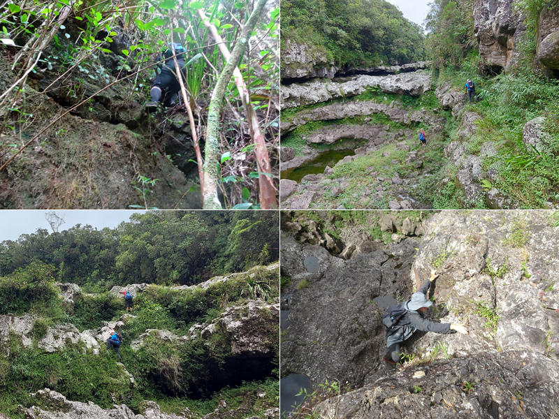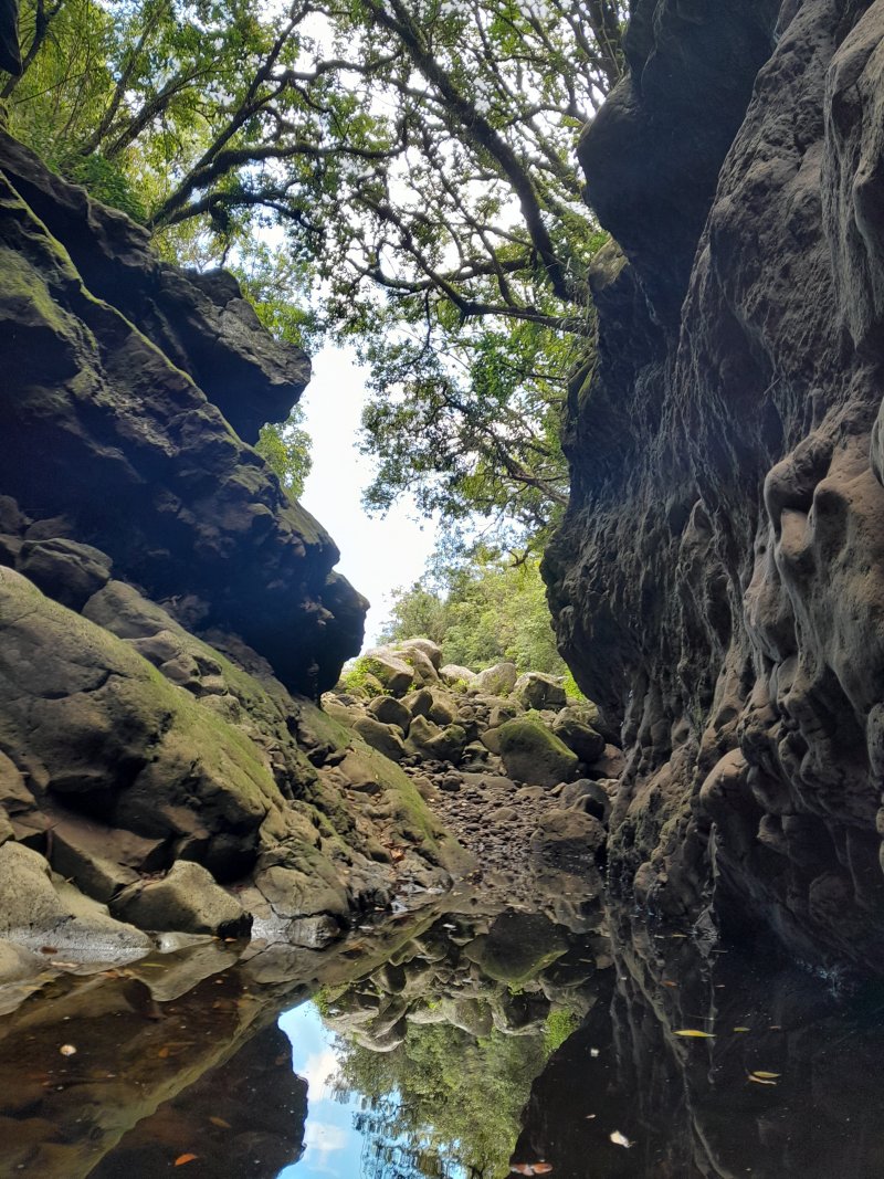 La randonnée débute au plus près de l'Ancienne Nationale pour éviter de trop marcher sur la RN3. Une aire de repos avec un grand kiosque est l'endroit idéal pour stationner. Partir vers Saint-Benoît en profitant du paysage sur le Piton Camp de Tête et les remparts vers la Cascade Biberon (Photo 1). L'Ancienne Nationale est étroite mais on trouve facilement le début sous les grands platanes laissant à l'automne une épaisse couche de feuilles mortes (Photo 2). On devine au sol des portions encore grossièrement pavées de pierres de lave. La végétation est très fournie entre les platanes lorsqu'ils sont verts. Les bambous et Tibouchina tentent de surmonter l'envahissement par les longoses (Photo 3). Après quelques virages, on domine au plus près le lit de la Ravine Sèche en profitant du paysage vers le Piton Camp de Tête (Photo 4). Un long lacet bordé d'azalées mène tranquillement vers la Maison Servaux (Photo 5). Juste avant l'ancienne case, repérer à gauche le début du sentier du point de vue sur Grand Etang. Le passage est devenu étroit mais se suit sans difficulté. On parvient à une clairière bordée de goyaviers et de platanes (Photo 6). Poursuivre la descente ombragée jusqu'à la Ravine Sèche. L e sentier se poursuit sur l'autre rive mais on oblique à droite pour marcher en direction du cassé que l'on devine plus loin. Le cheminement s'effectue sans danger sur de larges plaques de basalte (Photo 7). Comme au Bassin Cadet, le sol est usé par les crues, découpé en dentelle ou creusé de marmites parfois profondes (Photo 8). Un premier bassin se contourne sans mouiller les pieds (Photo 9). Un autre, plus large s'évite facilement pour s'approcher du cassé (Photo 10). Prudence en s'approchant du bord. La falaise verticale de 50 m domine un très grand bassin qu'on devine au pied (Photo 11). Profiter du spectacle et des Mornes de l'Etang couverts d'une végétation dense avant de faire demi-tour car réservé aux canyonneurs (Photo 12). En arrivant au sentier, il est possible de remonter jusqu'au bassin amont dans les mêmes conditions de marche et d'exploration (Voir carte). On retrouve facilement l'Ancienne Nationale près de l'escalier et du sol bétonné ayant accueilli la Maison Servaux. De la case il ne reste que quelques poutres et tôles rouillées. Depuis l'emplacement on imagine très bien les immenses cultures de café puis celles de thé, vite abandonnées dans de nombreuses concessions (Photo 13). Reprendre la piste vers la RN3. Pour les curieux, deux bouches de tunnels de lave se situent à quelques mètres des ruines, sous un platane (Photo 14). La jonction avec la route ne varie pas entre goyaviers, califons, bois de chandelles ou paille sabre (Photo 15). Traverser en prenant garde à la circulation parfois importante et marcher en direction d'une touffe de palmistes proche des premiers camphriers de la ligne domaniale, facile à repérer sur la carte (Photo 16). De la ligne domaniale, il ne subsiste que quelques clairières à l'ombre de grands camphriers (Photo 17). Poursuivre jusqu'à la petite ravine marécageuse et obliquer à gauche pour s'approcher au plus près de la nouvelle ruine du parcours (Photo 18). Sans être une aventure insurmontable, la suite du parcours est une immersion dans les fougères et les goyaviers où il faut constamment garder les yeux au sol pour rester sur le sentier boueux (Photo 19). On n'est jamais très loin des camphriers plantés par l'ONF au siècle dernier (Photo 20). Le sentier se termine à la ravine, à quelques mètres d'un premier cassé. Entamer la remontée de ce deuxième cours d'eau de la journée en retrouvant les rives basaltiques tourmentées (Photo 21). Rien de bien dangereux que ce cheminement entre roches usées, crevasses, marmites ou petits canyons étroits et sauvages (Photo 22). Si le premier se passe dans le lit, d'autres devront être contournés. Les paysages sont assez sauvages et originaux pour ne pas regretter d'être venu (Photo 23). Grottes, canyons, falaises couvertes de végétation luxuriante et basaltes se succèdent (Photo 24). Un magnifique canyon très tourmenté doit se contourner par la rive droite pour réduire les dangers (Photo 25). La pente est parfois forte, les blocs rocheux imposants, obligeant à quelques acrobaties pour les franchir (Photo 26). Après 30 minutes de montée on parvient à une falaise de plus de 40 m de hauteur qui signe la fin du circuit proposé (Photo 27). Avant de faire demi-tour, admirer cette falaise couverte de longues fougères retombant vers le sol (Photo 28). Faire demi-tour, rejoindre la ligne domaniale, la ruine, la RN3, partir à gauche et rejoindre le parking en prenant garde à la circulation. Nous n'avons pas effectué le retour par la route puisque, poussés par le désir d'aventure à partir de la falaise aux fougères, nous avons poursuivi jusqu'au radier de la ligne des Deux Mille en Dessous (Voir § ci-dessous).