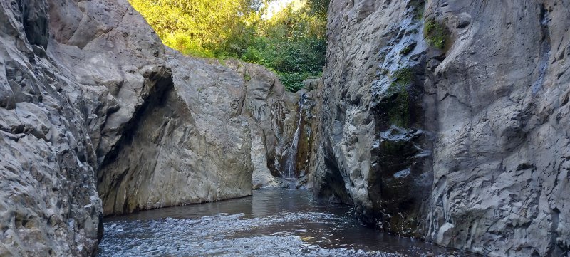 La randonnée débute au Pont de l'Escalier enjambant la Rivière du Mât d'une quinzaine de mètres. La première chose à effectuer avant de se lancer est de regarder le niveau de l'eau. Si les bancs de sable sont visibles et que la puissance de l'eau semble faible, il est possible de poursuivre (Photo 1). Dans le cas contraire, préférer une visite à la Cascade Blanche. Passer devant la sculpture et la chapelle puis marcher en direction de Salazie jusqu'au poteau électrique et au panneau sur les risques d'éboulis. Le sentier débute exactement entre les deux, dévale de manière abrupte par endroits au milieu des longoses et se termine en deux minutes le long des gros galets du lit de la rivière (Photo 2). Entamer la remontée en longeant les berges facilement. On passe devant un kiosque et un long escalier grimpant vers une habitation. Le fleuve est large, calme, très peu encombré de grosses roches. De nombreuses petites cascades tombent des falaises en rive gauche (Photo 3). D'autres surgissent directement du hameau de l'Escalier dominant la rivière (Photo 4). Remarquer au passage la belle falaise en rive droite où les jamrosats maintiennent les rochers au-dessus du vide. Plus haut, la vallée se rétrécit et comporte de jolies zones rocheuses usées par les crues (Photo 5). De nouvelles petites chutes d'eau et sources amplifient le courant qui peut être fort par endroits (Photo 6). On pénètre enfin dans un beau canyon très étroit où l'eau coule paisiblement. Le niveau est très variable selon l'épaisseur du sable qui en tapisse le fond (Photo 7). Prendre tout son temps pour choisir les meilleurs passages où la hauteur d'eau est la plus faible. On parvient à une nouvelle petite cascade tombant dans un minuscule bassin basaltique (Photo 8). Sur la gauche, le torrent devenu très étroit, charrie une eau trop fougueuse pour envisager de poursuivre sans danger. Faire demi-tour, reprendre le chemin inverse, marcher sur les berges et retrouver la falaise aux jamrosats (Photo 9). Le temps de monter, de faire demi-tour et de revenir aux modestes cascades rencontrées à l'aller, le soleil s'est élevé et éclaire les voiles de mariées tombant de la falaise (Photo 10). Spectacle garanti et douche possible en période chaude (Photo 11) ! On frôle à nouveau le kiosque, le sentier pris en descente et la marche se poursuit jusqu'au nouveau canyon creusé de toutes parts de grottes plus ou moins vastes (Photo 12). On parvient très rapidement au pont qui a permis d'évaluer le courant en début de parcours. Par temps humide, éviter de trop marcher en rive droite constituée d'amoncèlements de couches sédimentaires ne demandant qu'à dégringoler dans l'eau (Photo 13). Plus bas, à la verticale de la route, là où les véhicules ralentissent sous les éclaboussures du "pisse en l'air", la rivière fait un coude creusé par l'eau (Photo 15). On se retrouve ensuite à traverser le Bras de Caverne qui finit sa course à travers de grosses roches (Photo 16). Cent mètres plus loin, un escalier partant de la berge attire le regard. Il mène à une belle aire de pique-nique visitée pour l'occasion (Photo 17). Attention cependant car cette aire est privée. Depuis la route, elle se rejoint à partir d'un snack installé près d'un portail fermé. Des chiens gardent cette aire et il est plus prudent de rester à la première table rencontrée au plus près de la rivière. La descente se poursuit de manière très agréable dans une eau claire, une large vallée et en profitant des superbes vues sur les pitons environnants (Photo 18). Ne pas manquer les deux nouvelles chutes signant la fin de la courte Ravine Gaye ayant pris sa source sur les flancs du Morne des Lianes (Photo 19). La marche est toujours aussi facile sur le sable ou les petits cailloux des berges avec vues nombreuses sur le Piton Bonnet d'Evêque (Photo 20). La vallée se rétrécit au niveau de l'Îlet Payet perché au sommet de la falaise verticale recouverte de bambous nains du plus bel effet (Photo 21). Le fleuve coule dans une vallée de plus en plus large mais encore très agréable (Photo 22). Quelques gros rochers se remarquent mais ils sont rares (Photo 23). Un pont Bailey a été installé dans la partie aval la plus étroite de la vallée pour relier l'îlet à la route de Salazie (Photo 24). Une fois le pont franchi, la vallée, toujours aussi plate, s'élargit à nouveau et se couvre de roches plus grosses ne gênant cependant pas la progression (Photo 25). La rivière effectue un important virage vers la gauche avant de s'enrichir des eaux du Bras des Lianes, très facile à traverser. Les roches deviennent de plus en plus nombreuses et la descente perd de son intérêt ludique (Photo 26). La rivière est si calme par endroits qu'il n'y aurait aucun danger de s'y baigner (Photo 27). La pente s'accentue et quelques rapides peu dangereux par eaux basses amènent au barrage situé au village de la Rivière du Mât les Hauts. A partir d'une petite cascade en rive droite, les incursions des baigneurs venant des berges et du sentier du Bassin de la Mer sont fréquentes. Nous avons choisi d'escalader la petite chute d'eau et de retrouver ce sentier moins de 10 m plus loin (Photo 28). Finis les galets, le sable dans les chaussures et l'eau jusqu'au mollet. La marche en pleine verdure sur un sentier large, bien entretenu, mène sans effort au Parc des Berges. Le pont et le point de départ se rejoignent en quelques minutes.
