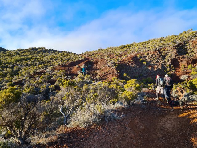 La randonnée débute à l'aire de pique-nique de Bois Ozoux sous des dizaines de petits tamarins. Rejoindre le GRR2 qui remonte vers l'Oratoire Ste-Thérèse. Le sentier, en pente légère, est bien marqué à travers les brandes d'altitude (Photo 1). Marcher jusqu'à la Stèle Josémont Lauret en profitant de magnifiques panoramas sur le Piton des Neiges et vers le Nez de Bœuf. Dix mètres avant le monument vieillissant, obliquer à gauche puis emprunter un étroit sentier remontant en direction du sommet du Piton des Feux de Manzac. Il est emprunté principalement par les fidèles qui viennent prier la petite vierge perchée à 2384 m d'altitude. La croix qui lui tient compagnie et qui orne le sommet n'est visible ni de la route ni sur les cartes (Photo 2). Poursuivre sur l'arête sommitale rocheuse où peu de végétation vient gêner la marche (Photo 3). Redescendre et obliquer à droite pour retrouver pour quelques instants le GRR2 et la piste empierrée menant à la Caverne des Lataniers. La caverne, fouillée par les archéologues en 2017, a retrouvé son aspect habituel et peut abriter plusieurs personnes en cas de pluie. Elle aurait longuement abrité le roi Manzac, sa femme la Reine Fouche, plusieurs marrons au 18ème siècle ainsi que des chasseurs d'esclaves ou premiers explorateurs. Les abords de la caverne auraient même accueilli un abri dont on peut apercevoir quelques traces de murets (Photo 4). Quitter les lieux pour marcher vers l'ouest en direction de collines non marquées sur la carte mais bien visibles sur le terrain (Photo 5). La marche est aisée et respectueuse de la flore si l'on prend soin de contourner les touffes de branles blancs ou verts (Photo 6). La végétation rase de la région permet des panoramas de tous côtés. On domine la Plaine des Cafres, la vallée de la Rivière des Remparts et le Cratère Commerson datant de 60 ap. JC (Photo 7). Se diriger ensuite vers le piton 2390 qui se remarque aux roches empilées au sommet et se rejoint très rapidement à travers de vastes étendues de thym marron (Photo 8). Le chaos rocheux se traverse facilement avant d'entreprendre la jonction avec le piton 2399 (Photo 9). Les grandes étendues de thym permettent une marche rapide totalement à plat (Photo 10). Le bord du cratère comporte des zones rocheuses avec de belles formes minérales (Photo 11). Longer le cercle presque parfait du cratère puis prendre ensuite la direction du Rempart des Basaltes en escaladant ou en évitant le piton 2412 déjà présenté dans une autre boucle hors sentier (Photo 12). Rejoindre la piste puis le sentier menant à l'oratoire Ste-Thérèse et le Piton des Basaltes surmonté d'antennes. Profiter des superbes vues sur le Fond de la Rivière de l'Est et sur le piton éponyme (Photo 13). On peut filer en hors sentier pour rester dans l'esprit de cette boucle ou longer le sentier menant au Piton de l'Eau pour continuer à profiter des paysages sur la droite (Photo 14). Rapidement, trouver un passage facile dans la végétation pour atteindre le piton 2361 que l'on remarque depuis le sentier (Photo 15). La montée rapide est facile. Poursuivre vers l'est en serpentant entre les touffes de diverses brandes. Après un km on se retrouve face à un cône éruptif récent, nu, où des traces de sentiers montrent qu'il est régulièrement visité (Photo 16). Les gratons de la coulée de lave du Petit Cratère sont instables autour de la bouche abritant quelques instruments de l'observatoire du volcan. Après ce cratère, se diriger ensuite vers le Piton Sauvetage qu'on escalade quelques minutes plus tard. Une fois au sommet on domine à nouveau la région et la prairie circulaire occupant le fond de l'ancien cratère (Photo 17). Partir sur la gauche en longeant l'arête du cratère et trouver dans le bas le petit sentier menant à la prairie (Photo 18). Avant de poursuivre, monter un peu dans les branles puis rejoindre la grotte qu'on devine depuis la prairie. Cet abri naturel a sans doute connu la visite de Manzac même si on n'en trouve mention nulle part (Photo 19). Il reste dans la région de nombreux petits cônes éruptifs anciens entre le Piton Sauvetage et la Piste Forestière du Piton de l'Eau (Photo 20). Le premier rencontré est le piton 2276 recouvert de tant de végétation qu'on n'y trouve que très peu de traces de passages des bovins. Son ascension est courte mais intense car il faut se baisser constamment pour passer sous les branches. Il faut même ramper par endroits pour faire passer plus facilement le sac à dos (Photo 21). Cette ascension est facultative pour cette raison même si on y rencontre une grotte originale dans la descente. Le piton 2220 est plus facile d'accès. On chemine dans des branles plus grands que depuis le départ, ponctués par endroits de quelques tamarins (Photo 23). On peut là aussi éviter le piton ou en escalader les flancs en passant toujours sur des zones sableuses sans végétation ou sur des sentiers créés par les petites vaches. La végétation devenant plus dense, filer plein nord pour rejoindre le sentier du Piton de l'Eau. Partir à gauche pour traverser la tamarinaie au pied du Piton Tangues, idéale pour une pause sur la pelouse. Certains arbres, tombés au sol, poursuivent leur croissance dans des positions très biscornues (Photo 24). Il est alors possible de poursuivre par les sentiers jusqu'au Bois Ozoux ou, comme ici, entamer une longue boucle pour atteindre et contourner le piton 2368. C'est parti pour un long périple qui zigzague entre les touffes ou bosquets en cherchant toujours à marcher sur les plaques sableuses (Photo 25). Ces espaces deviennent glissants dans les fortes pentes (Photo 26). Une fois au plus près du sommet il est possible de rejoindre le Piton des Feux de Manzac ou de longer la vallée d'un affluent du Grand Bras Piton. Dans ce cas, le parcours passe près d'un rocher dans lequel on voit deux nouvelles Vierges. Seuls les randonneurs aimant le ho