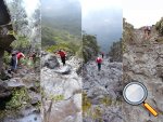 La randonnée débute au pied du Pas des Sables où quelques emplacements permettent de stationner au moment où la piste est couverte de nids de poules. Commencer la boucle en longeant le rempart en direction du Plateau des Basaltes. En hiver, le sol peut être couvert de gelée blanche et la température est alors assez basse (Photo 1). Le sable de la plaine, l'herbe et les cristaux de glace crissent sous le pied tant que le soleil n'est pas haut (Photo 2). La marche hors sentier est très agréable puisque toujours à plat. On rencontre bientôt un petit sentier longeant le rempart avant de rejoindre le GRR2 venant du gîte et partant à l'assaut du Plateau des Basaltes. La montée en plusieurs lacets s'effectue sur un large sentier, très encombré de cailloux de toutes tailles (Photo 3). La grimpette de 150 m s'effectue assez rapidement jusqu'au plateau qui se traverse en quelques minutes en direction de l'Oratoire Ste-Thérèse. Juste avant d'y parvenir, on a de nombreux points de vue sur le Fond de la Rivière de l'Est et l'on cherche des yeux le meilleur passage pour y descendre (Photo 4). Quelques mètres avant l'oratoire, une zone sableuse plus large que les autres est le point de départ de la descente. Les branles verts, ambavilles ou rares fleurs jaunes sont assez ras et le début de la descente est "presque facile" en cherchant des yeux les endroits sans végétation (Photo 5). Quelques minutes après le départ, on rencontre une vierge si cachée que peu de fidèles doivent en connaître l'existence. La désescalade comporte déjà quelques hautes marches obligeant à employer les mains pour se maintenir (Photo 6). On foule du pied des ajoncs d'Europe éradiqués par les agents de l'ONF, preuve que si des ouvriers passent, les randonneurs peuvent également se frayer un passage. La pente est raide même si elle est irrégulière, présentant parfois des pourcentages plus forts qu'ailleurs (Photo 7). Le Plateau des Basaltes, énorme en début de descente diminue de taille de minute en minute (Photo 8). La végétation grandit régulièrement et quelques arbres font leur apparition (photo 9). Lorsqu'elle dépasse la taille d'un homme et que la pente s'accentue par endroits, difficile de naviguer à l'œil. Il faut régulièrement faire le point pour éviter ou contourner les barres rocheuses bien marquées sur la cartes IGN (Photo 10). Même bien étudié, le parcours comporte cependant quelques passages acrobatiques où les mains sont de nouveau nécessaires ainsi que les arbustes pour ralentir la descente (Photo 11). Après 500 m assez sportifs et deux heures de descente, la plaine approche mais il faut encore effectuer quelques périlleuses descentes de petites ravines dont celle du Piton Rond (Photo 12). Un gros bois rouge tortueux marque la fin de la descente. Les bouses de vaches et traces de sabots indiquent que le fond est atteint pour une première pause. On se retrouve dans le lit rocailleux de la Ravine du Piton Rond et il est alors possible de partir dans n'importe quelle direction (Photo 13). Un coup d'œil à l'arrière permet de mieux comprendre à quoi ont été occupées les 170 dernières minutes (Photo 14). Le Fond de la Rivière de l'Est est une vaste zone partagée entre coulées de gratons, prairies naturelles, larges méandres de rivières coulant totalement à plat et vastes étendues de forêts de tamarins des Hauts (Photo 15). La ravine, très large par endroits, a drainé d'importantes quantités de sable venu des remparts (Photo 16). Ailleurs, la marche est une balade familiale comparée à la descente du rempart (Photo 17). Partir un peu sur la droite et prendre le Piton Rouge comme point de repère. Les brandes font leur retour et les multiples sentiers créés par le passage des bovins permettent de marcher rapidement, tout d'abord en direction du Piton de l'Îlet (Photo 18). La traversée d' importants amoncèlements de gratons qui l'entourent rendent difficile son ascension (Photo 19). Tout près, à l'inverse, la montée au Piton Rouge est facile et ludique dans un environnement de sables rougeoyants à l'origine du nom du piton (Photo 20). On a, depuis le sommet, des vues imprenables sur toute la vaste plaine, sur la Ravine Haüy qu'on va bientôt rejoindre et sur un cône éruptif ou de dégazage très esthétique (Photo 21). Le rejoindre ne prend que quelques minutes sur un sol très glissant. La bouche couverte d'éclaboussures de lave cache une cavité d'une quinzaine de mètres de profondeur sans doute visitée depuis longtemps par les spéléologues. A 30 m de là, dans le fond de la vallée, coule la Ravine Haüy qui se rejoint sans problème à travers les branles. Le fond, tout d'abord couvert de galets devient plus haut complètement nu et basaltique et bordé de magnifiques tamarins (Photo 22). Les petits cassés inévitables dans ce type de terrain se contournent aisément (Photo 23). D'autres, plus hauts ou plus déchiquetés demandent quelques petites contorsions sans danger pour les franchir (Photo 24). A partir de l'altitude de 1995 m, il est encore possible de remonter cette large ravine mais un très haut cassé est infranchissable 150 m plus loin. C'est donc par la Ravine Saucisson que se poursuit cette sortie en hors sentier depuis le Fond de la Rivière de l'Est. La Ravine Saucisson, plus étroite, plus encombrée de roches donne immédiatement le ton par une pente très forte (Photo 25). Puis les roches disparaissent, laissant la place aux basaltes lisses et très glissants, à proscrire totalement en cas de pluie. Les grottes, failles, cavités ou curiosités géologiques se multiplient mais la pente ne faiblit toujours pas (Photo 26). C'est même l'inverse qui se produit avec des tronçons aux pourcentages impressionnants où les quatre pattes sont indispensables au cheminement (Photo 27). A 2200 m, la pente s'assagit, le lit retrouve les cailloux, les flaques et un sol sculpté par l'érosion. On parvient rapidement
