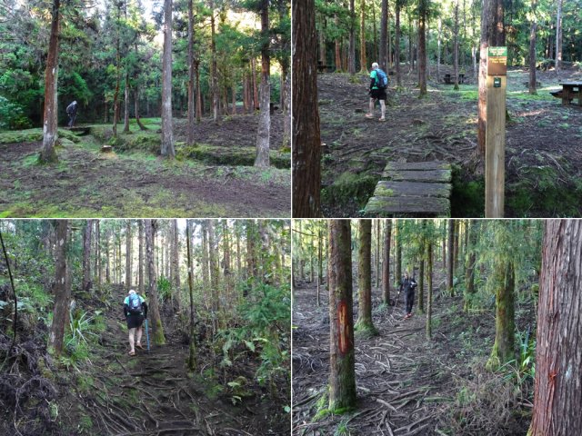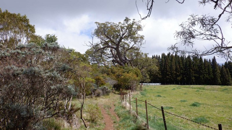 La randonnée débute ici à l'arrêt de bus du Bras des Calumets. Quelques mètres plus loin, en face du sentier remontant vers la croix du Piton des Songes, commence la Rue Emile Evan. Cette rue calme, rectiligne, sans circulation, permet d'apercevoir le Piton Textor, point culminant de cette sortie (Photo 1). Après une portion plane, quelques lacets en montée raisonnable et une descente en pente douce vers Bras Piton, la route effectue un grand virage avant d'arriver à l'aire de pique-nique du Piton Doré. Le sentier débute entre les kiosques et les cryptomerias. La pente est d'abord faible sous les conifères sur un sol constitué essentiellement de racines (Photo 2). La pente s'accentue pour contourner le cratère du Piton Doré recouvert de fanjans et bordé de cryptomerias (Photo 3). Une fois le cratère dépassé, le sentier effectue quelques virages et comporte beaucoup de raccourcis créés par les marcheurs. Rester sur la trace principale même si les racines sont encore présentes.(Photo 4). Plus haut, le sentier pénètre dans le Parc National en même temps que dans la zone de tir des militaires. Un panneau rouge est d'ailleurs là pour dissuader de quitter le sentier qui grimpe droit entre la lisière des cryptomerias et celle des bois de couleurs jaunis par les mousses (Photo 5). Plus loin, on est totalement immergé dans cette forêt semi-primaire comportant des passages techniques, de hautes marches et de rares portions planes (Photo 6). Quelques parties de cette forêt sont magnifiques avec les mousses et épiphytes recouvrant la totalité des troncs (Photo 7). Dans la montée, quelques rubalises attirent le regard. Elles ont été posées afin de signaler un trou profond au ras le sentier. Il s'agit de l'entrée effondrée d'un tunnel de lave de quelques centaines de mètres de long dont l'accès est très difficile (Photo 8). Après le gouffre, le sentier comporte de plus en plus de tronçons constitués de marches plus régulières que les naturelles rencontrées plus bas (Photo 9). On domine la Ravine Edouard sur la droite. On peut ainsi bénéficier des premiers panoramas sur la Plaine des Palmistes et le Piton des Neiges (Photo 10). Puis la pente faiblit jusqu'à devenir plate par moments. Le sentier, beaucoup plus propre serpente dans un superbe sous-bois de branles verts et d'ambavilles (Photo 11). Il traverse également quelques bosquets de petits tamarins envahis de vieux pieds de fleurs jaunes (Photo 12). La végétation disparaît graduellement et les branles verts, plus rabougris, prennent le relais. Quelques vaches parcourent les lieux. Si on ne les aperçoit pas toujours, les bouses dans le chemin les trahissent. Le sentier frôle le Piton de Caille avant de pénétrer dans une plaine herbeuse naturelle (Photo 13). Cette partie, qui peut être humide en période de fortes pluies, se traverse en quelques minutes en direction d'un petit col au pied du Piton Textor (Photo 14). La montée sur la terre rouge et les cailloux est rapide en rajoutant quelques mètres pour se rapprocher des 1000 m de D+ (Photo 15). Le paysage change encore et l'on retrouve les sentiers d'altitude avec les branles et les terres sableuses rouges ou orangées (Photo 16). Plusieurs itinéraires sont possibles du Textor jusqu'au Nez de Bœuf. Le trajet proposé contourne le Piton de Sable par le nord et file plein ouest pour éviter la route (Photo 17). A 2066 m, obliquer à gauche et rejoindre le parking du Nez de Bœuf par un très agréable parcours parfois ombragé (Photo 18). La pente est faible et la marche est une balade dans la verdure en profitant de nombreux panoramas vers la Rivière des Remparts (Photo 19). Traverser la route, rejoindre le parking puis emprunter le sentier remontant vers le sommet du Nez de Bœuf. A mi-parcours, obliquer à droite dans le bosquet de petits tamarins puis redescendre vers la route. Traverser à nouveau et pénétrer dans les prairies, guidé par les rangées de barbelé (Photo 20). Le GRR2, fortement creusé à cet endroit, est petit à petit remplacé par un autre longeant les clôtures. Bifurquer à droite au premier croisement et contourner les Trous Blancs par le nord. Si on ne les connaît pas, le tour par le sud ne rajoutera qu'une vingtaine de minutes. La descente vers les vastes zones d'élevage est rapide jusqu'aux premières clôtures (Photo 21). Après quelques virages, le sentier devient plus droit jusqu'au Tamarin Dodo qui mérite une respectueuse halte (Photo 22). Poursuivre jusqu'à la petite route sinueuse contournant le Piton Guichard. Traverser l'aire de repos et continuer sur le GRR2 bordé de cryptomerias sur un sentier large et caillouteux. Plus bas, au Grand Bras de Pontho, obliquer vers le sud, longer les prairies envahies de brandes et bordées de cryptomerias rougissants (Photo 23). Plus loin, un panneau signale la piste Sulzère. Partir à droite et longer de nouveaux pâturages envahis d'ajoncs par endroits. La pente est parfois forte sur un sentier étroit entre les clôtures (Photo 24). Prendre à droite à la fin du sentier et emprunter un très court tronçon du Chemin de la Grande Savane qui contourne le Piton Dugain (Photo 25). Au rond-point, repérer les poteaux du GRR2 et entamer la dernière partie sur une piste terreuse bordée par moment de tamarins des hauts (Photo 26). Cette piste longe au plus près le Grand Bras de Pontho, souvent caché par la végétation (Photo 27). La piste se termine à la Route des Herbes Blanches. Partir à gauche et longer la ravine jusqu'au pont de la RN3. Juste avant le pont, trouver l'étroit passage pour se rendre sous l'ouvrage et traverser pour emprunter le sentier en rive droite. Très fréquenté par les chevaux, il est malgré cela assez étroit et bordé de grands ajoncs d'Europe (Photo 28). On passe sans trop le remarquer au pied du Piton Desforges puis on termine au radier du Chemin Doret. Partir à gauche, rejoindre la Maison du Volcan ou le parking près de 