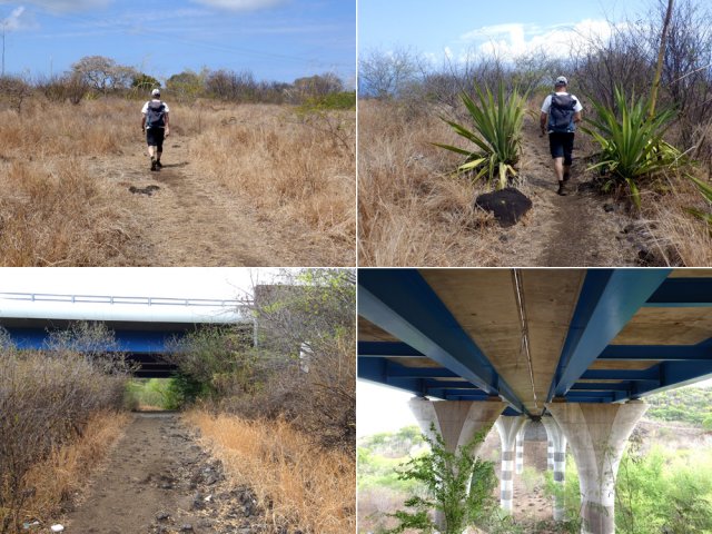 La randonnée débute ici à l'arrêt de bus des Filaos. Possibilités de stationner si on vient en véhicule. Juste en face de l'arrêt de bus, se trouve une large allée bien entretenue entre les habitations. Cela permet de se rapprocher de la mer sans passer par la route. L'endroit est calme, désert, verdoyant et arboré (Photo 1) Partir à droite à la première rue puis, très rapidement, poursuivre à gauche sur une nouvelle allée menant à la plage. Si d'autres circuits présentés sur le site empruntaient la plage pour marcher, il est proposé ici de la longer par un des nombreux sentiers faciles à repérer près du panneau du Conservatoire du Littoral (Photo 2). On est assez près du lagon pour s'en rapprocher et assez loin des habitations pour ne pas être gêné. Plus loin, les sentiers pénètrent dans des plantations et il est préférable d'emprunter la piste longeant les jardins (Photo 3). A l'approche de la Rue de Bourbon qui mène au port de Saint-Gilles on peut choisir entre la plage sableuse et la route bordée d'une bande piétonne ou cyclable (Photo 4). Cette courte portion s'effectue rapidement. Bifurquer à gauche vers le parking du port puis contourner les différents bassins pour se diriger vers la première passerelle rejoignant l'îlot central (Photo 5). On profite ainsi de panoramas sur la Plage des Roches Noires et sur le port lui-même, toujours en mouvement, surtout à la période des baleines (Photo 6). Après avoir emprunté trois de ces passerelles, suivre le sentier bétonné en rive droite de la Ravine de Saint-Gilles et tourner à droite sur la Rue du Général de Gaulle. Marcher jusqu'à la ravine, la dépasser et emprunter le sentier des Caméléons débutant à la baleine chamarrée au centre d'une placette (Photo 7). Le sentier des Caméléons est connu des randonneurs effectuant le circuit du Jardin Bottard à partir du théâtre. Il longe la ravine toujours en eau, la traverse par des gués aménagés et ne s'éloigne jamais des berges pour une véritable promenade (Photo 8). Longer petits champs, bambous et taros jusqu'au dernier gué avant la montée au théâtre. Continuer tout droit après le croisement sur ce qui était un sentier botanique qui a mal vieilli. On y rencontre d'énormes touffes de gros bambous (Photo 9) et de nombreux vestiges du canal transportant l'eau autrefois (Photo 10). Le sentier reste facile à suivre jusqu'au barrage de récupération des eaux alimenté par de petites chutes (Photo 11). Traverser sur l'écluse glissante et entamer la remontée inédite de la Ravine Saint-Gilles. Les traces de passage existent mais sont discrètes. Quelques contorsions et escalades sont nécessaires pour franchir les rideaux de liane papillon ou les grosses roches (Photo 12). Jamais on ne traverse la rivière. Jamais on ne s'en éloigne de plus de 20 mètres. On reste toujours en rive gauche sur le même type de terrain envahi de lianes, de bambous, de papyrus ou de roches (Photo 13). Plus haut, après 30 minutes de hors sentier, on entend enfin couler une cascade. On se retrouve en rive gauche du Bassin des Cormorans pour admirer la petite cascade et son grand bassin d'une manière inhabituelle (Photo 14). Traverser la ravine puis la bambouseraie et se diriger vers la ruine bordée d'un escalier assez raide (Photo 15). Emprunter l'un des sentiers classiques menant au Bassin des Aigrettes en suivant un canal toujours en eau (Photo 16). La visite à la haute cascade n'est pas obligatoire surtout qu'on en a une très belle vue d'ensemble en remontant la forte pente menant au canal du Bassin Malheur (Photo 17). Ce dernier, issu d'une résurgence, est en général assez fréquenté des baigneurs, excepté le matin de bonne heure (Photo 18). Contourner le bâtiment, grimper la très forte pente constituée de grosses roches et rejoindre l'échelle permettant de franchir la dernière falaise (Photo 19). Plusieurs itinéraires mènent au pont de la RN1 enjambant la Ravine de Saint-Gilles. Descendre l'escalier jusqu'à la ravine et la traverser pour remonter vers la savane couverte d'herbe jaune et parcourue de nombreux sentiers ou pistes. Le but est de traverser cette savane en utilisant des itinéraires non encore publiés sur ce site (Photo 20). Le circuit proposé se rapproche du golf puis rejoint une piste passant à nouveau sous la Route des Tamarins en rejoignant un corral fait de tôles ondulées. Poursuivre en descente en direction de la station de pompage de Moulin Kader dans la même savane aride ponctuée de quelques arbres chétifs (Photo 21). On devine la toiture rouillée de la station depuis la piste (Photo 22). Une fois au carrefour de la station, filer tout droit en direction d'une vaste zone cultivée traversée de larges pistes en terre ou bétonnées. On traverse ainsi de vastes cultures de pitayas, manguiers, fruits de la passion et même une vigne expérimentale entourée de grillages (Photo 23). La RD100 se remarque de loin à la circulation. Une fois sur cet axe très fréquenté, bien rester sur le sentier qui lui est parallèle durant quelques centaines de mètres (Photo 24). La zone traversée n'est pas la plus agréable de la journée mais on bénéficie cependant de belles vues en direction du lagon et de Saint-Gilles (Photo 25). Quelques petits sentiers partent sur la droite en direction de la nouvelle route menant au collège. Emprunter l'un d'entre eux entre épineux et ordures lancées depuis les véhicules puis longer cette route jusqu'au rond-point de la RD100 (Photo 26). Il faut, hélas, suivre à nouveau la RD100 sur moins de 500 m mais on rencontre également plusieurs sentiers partant sur la droite. Bifurquer sur l'un d'entre eux et trouver une belle trace dans les hautes herbes (Photo 27). La longue fin du parcours, tout en descente, sillonne entre les épineux jusqu'au hameau de l'Œil de Bœuf (Photo 28). Rejoindre la route, partir à gauche et marcher jusqu'à l'arrêt de bus, fin de la boucle.