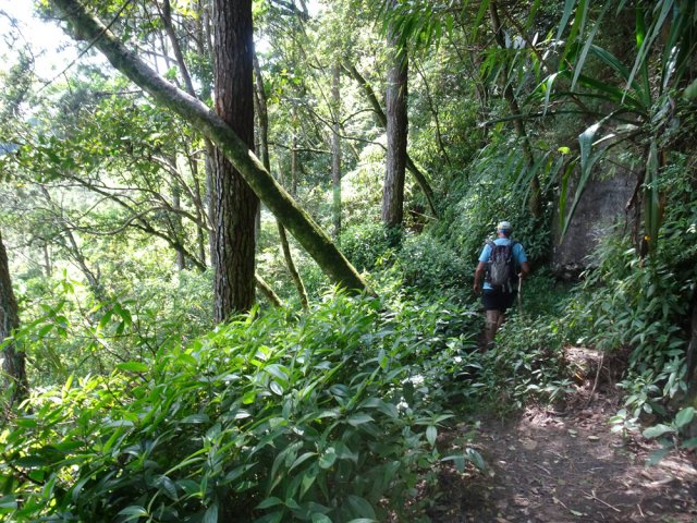 La randonnée débute au parking situé au carrefour de l'Avenue de la Vignac et Georges V Avenue qu'on atteint difficilement sans GPS si l'on ne connait pas la ville. Suivre le flot de touristes étonnés de croiser des marcheurs portant sac à dos et bâton ! On arrive sur une large avenue permettant d'apercevoir sur la droite la haute tour bleue de la station météorologique (Photo 1). Avant de se lancer sur le tour du cratère, se diriger vers un point de vue permettant de distinguer le fond pour en apprécier la profondeur et la végétation couvrant les flancs (Photo 2). Partir vers la droite puis longer le petit sentier qui borde l'avenue (Photo 3). Dépasser un peu la station météo et trouver la porte dans le grillage qui annonce le début du sentier (Photo 4). Le sentier ne plonge pas vers le centre. Il longe le rempart en descente douce en passant au début sous des touffes sombres de bambous (Photo 5). Le passage, peu fréquenté, n'est pas très large mais se suit sans hésitation dans une végétation très variée (Photo 6). Il est parfois très envahi et il faut un peu jouer des coudes pour pousser les tabacs bœuf et autres invasives (Photo 7). On a l'impression de côtoyer toutes les plantes et arbres de l'île, jusqu'aux ravenelles et pins (Photo 8). On aperçoit le fond entre les trouées. La tour bleue dépasse de la cime des arbres (Photo 9). Après quelques passages étroits et glissants où le pied a vite fait de partir dans le vide, on parvient au début d'une descente beaucoup plus forte que depuis le portillon (Photo 11). C'est le seul passage délicat car la glissade est facile malgré les plantes pour se maintenir (Photo 12). On parvient presque au fond du cratère. Il faut ensuite traverser une zone couverte de bananiers à fleurs poussant dans une zone humide où il est facile de perdre la trace (Photo 13). On remarque des murets, signe de l'organisation du lieu quelques décennies en arrière. Poursuivre et traverser une zone très envahie où la trace se rebouche aussitôt après le passage (Photo 14). Le sol, au fond du cratère, est presque entièrement couvert d'une plante aux feuilles grises, la persicaire du Sénégal, adepte des sols humides (Photo 15). Beaucoup de photos du lieu montrent un petit lac recouvrant le fond du cratère. Lors de notre passage, seule une mare d'eau croupissante occupait une petite place dans les persicaires (Photo 16). Le sol est d'ailleurs assez ferme pour pouvoir marcher sans crainte (Photo 17). Reprendre le chemin inverse puis traverser les hautes plantes en direction des bananiers (Photo 18). Traverser les bananiers et de grandes étendues de taros (Photo 19). Reprendre la montée, courte mais difficile sur le sentier étroit et envahi (Photo 20). On retrouve les zones de tabac bœuf où il faut faire très attention où poser le pied car la glissade est fréquente, mais heureusement stoppée par la végétation (Photo 21). Passer le portillon et reprendre le sentier entre grillage et route (Photo 22). Sur la droite, un écart est possible vers une zone verte en empruntant un beau sentier bordé de barrières (Photo 23). Profiter des panoramas en direction des montagnes à l'horizon (Photo 24). Idéalement placée au centre de l'île, la ville permet de repérer les principaux sommets dont la Montagne des Remparts et le Mont-Saint-Pierre, tout proche. On frôle un autre parking tout aussi fréquenté que celui du départ. La fin de la boucle longe toujours au plus près le grillage sans risque de s'égarer (Photo 25). Un nouvel écart permet de se rapprocher du cimetière des Esclaves malgaches où des cérémonies sont organisées à l'occasion de la fête de l'abolition (Photo 26). Un point de vue plus important que les autres donne sur le fond du cratère pour repérer les lieux visités 30 minutes avant (Photo 27). On rejoint très vite le parking.