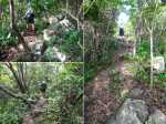 Randonnée en aller-retour : La randonnée débute sur la côte entre Quatre Sœurs et Grand Sable. Éviter de stationner au début de la piste. Un emplacement côté montagne se trouve moins de 50 m plus au nord. Entamer une montée régulière sur piste à bandes de roulement, remplacée plus haut par un chemin de desserte des champs (Photo 1). Les points de vue sur l'océan sont nombreux. A la fin de la montée sur piste, on parvient aux vestiges d'une ancienne habitation près d'une citerne d'eau. Partir à gauche et poursuivre sur le sentier du Chat et la Souris path. Il pénètre dans le sous-bois clairsemé, jamais envahi de pestes végétales. La pente est de plus en plus forte sur une trace très peu marquée et recouverte d'une épaisse couche de feuilles mortes (Photo 2). Le sentier se confond avec les traces laissées par les animaux, celles des écoulements de l'eau ou des petits éboulis. Heureusement, des taches de peinture et quelques liens attachés aux branches rassurent sur la direction à suivre (Photo 3). Il faut constamment se pencher vers l'avant ou attraper les troncs pour s'aider dans la grimpée. On parvient à la crête. La pente cesse. Partir sur la gauche et continuer à suivre le balisage sommaire à travers les arbres. On s'est élevé de 200 m, ce qui permet de plus vastes panoramas en direction de la mer (Photo 4). Côté montagne, ce sont les dents caractéristiques de la Montagne Bambou qui se remarquent le mieux (Photo 5). Totalement à droite, on distingue également le rocher du Chat. Poursuivre assez facilement sur la pente faible tout en continuant de bénéficier de splendides points de vue (Photo 6). On distingue les nombreux parcs d'élevage de poissons au large et les bateaux qui s'en approchent. La nature est belle même si les lianes papillon ont tendance à envahir, mais dans des proportions moindres qu'à La Réunion (Photo 7). Le passage, assez large, comporte quelques grimpettes et des zones pierreuses (Photo 8). Plus haut, la crête devient de plus en plus rocheuse, obligeant parfois à lever haut la jambe (Photo 9). Certaines parties rocheuses pourront s'avérer vertigineuses pour certains randonneurs (Photo 10). Plus on monte et plus le rocher du chat grossit. Il ne ressemble en rien au matou que l'on espère (Photo 12). Les derniers mètres comportent encore quelques passages sportifs où les glissages sont possibles (Photo 13). Le sentier prend fin au pied de la haute roche. On arrive près d'une tunique de couleur aperçue lors de la montée. Elle ne résistera pas au temps contrairement à la plaque de marbre rappelant l'accident de 2019. Cette plaque présente l'avantage de permettre de réfléchir sur la volonté ou non de grimper sur ce chat immobile depuis des millénaires. Si la décision est prise de poursuivre, prendre garde à toujours avoir trois points d'appui et à utiliser les aspérités naturelles du monolithe pour arriver au sommet (Photo 14). Après un dernier rétablissement, on est tout à la joie de profiter d'un magnifique 360° s'il n'y a pas trop de vent qui pourrait déséquilibrer (Photo 15). Même s'il est possible de regarder la Souris depuis ce rocher en se couchant au sol, il est préférable de redescendre très prudemment et de trouver le petit sentier qui plonge dans les goyaviers. Après 15 m de descente on peut voir la roche sans danger. Il faut là aussi de l'imagination pour y deviner une souris (Photo 16). Les randonneurs non tentés par l'aventure qui suit feront demi-tour par le même itinéraire.