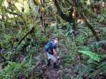 La randonnée débute à quelques mètres du minuscule parking herbeux, côté Sud. Aucune trace de passage durant deux mètres, comme si ce départ de sente devait rester invisible le plus possible (Photo 1). On est immédiatement enveloppé par cette magnifique forêt primaire ou les arbres moussus abritent des dizaines de variétés d'épiphytes (Photo 2). Ne pas se lancer sans garder à l'esprit que la trace sera très difficile à repérer. Des signes ne trompent pourtant pas. On remarque régulièrement des entailles plus ou moins discrètes sur les écorces des arbres ou arbustes, une absence de mousse là où les pieds ou les fesses se posent sur les troncs, les éternelles bouteilles et boîtes vides, des morceaux de sacs plastiques, le tout laissé par les visiteurs (Photo 3). Côté effort, se préparer à se baisser souvent pour passer sous les arches végétales, à grimper ou descendre des talus et enjamber des dizaines d'arbres couchés au sol depuis des décennies (Photo 4). Hormis ces détails, la description de la boucle est assez facile : marcher dans la forêt primaire en prenant garde à ne pas quitter le sentier et tenter de reconnaître toutes les plantes rencontrées (Photo 5). La forêt est très touffue excepté quelques courts tronçons où le regard porte à une trentaine de mètres (Photo 6). Un seul point de vue, à travers les arbres, est possible sur la face est du Piton des Neiges (Photo 7). On le retrouvera lors de la traversée du Plateau de Thym. Le sentier, toujours aussi étroit, traverse facilement plusieurs petites ravines avant de parvenir à une plus importante, affluent de la Rivière des Marsouins. Pas de sentier en rive droite escaladant le talus vertical. Il faut donc partir vers l'amont de la ravine en suivant les traces encore plus discrètes qu'en forêt ou marcher sur les galets (Photo 8). De grands bassins bordés de magnifiques tamarins s'évitent par des traces de contournement (Photo 9). La ravine, qu'il faut suivre sur exactement 600 m, traverse la belle forêt où les énormes branles moussus côtoient les tamarins des Hauts et fanjans (Photo 10). Certains passages peuvent s'avérer techniques ou glissants. Prendre son temps pour ces passages qui ralentissent une marche déjà très lente (Photo 11). Comme toutes les ravines de l'île, le fond basaltique peut être très découpé et proposer marmites, petites chutes ou bassins d'eau souvent rougie par les oxydes de fer (Photo 12). Si elle inspire peu pour la baignade, elle s'avère agréable pour laver la boue des chaussures. Après 500 m de montée, repérer une petite chute et deux grottes sur les côtés. C'est là que se poursuit la boucle. Mais avant de revenir en forêt profonde, poursuivre vers l'amont jusqu'au camp de braconniers. Ils ont choisi le meilleur emplacement pour pouvoir se reposer à plat mais aussi se baigner sous une petite cascade et son grand bassin (Photo 13). Redescendre jusqu'aux deux fanjans repérés en montant au milieu du lit de la ravine (Photo 14). C'est reparti pour la marche en forêt en escaladant tout d'abord la rive gauche au plus près de la grotte (Photo 15). C'est aussi reparti pour la chasse aux encoches ou emplacements privés de mousse sur des pentes parfois très fortes (Photo 16). On retrouve avec plaisir arbres, épiphytes, mousse, fougères et orchidées (Photo 17). Il faut à nouveau franchir de petites ravines sans eau (Photo 18). L'une d'entre elles, plus large et plus profonde que les autres est totalement envahie de bringeliers, jouvences mais surtout vigne marronne qui peut griffer au passage (Photo 19). La pente est forte pour sortir de la vallée. En arrivant plus haut, plusieurs passages semblent se présenter. Les délaisser pour partir à angle droit vers la droite en se repérant aux écorces blessées. Quelques efforts sont encore nécessaires pour le franchissement de talus assez hauts et bien marqués sur les cartes (Photo 20). Après 4 heures de marche, le sentier descend et l'on devine plus de lumière à l'avant (Photo 21). On se retrouve sans transition sur le Plateau de Thym entouré de falaises verticales. Les branles ont remplacé la forêt. Le sol est recouvert de mousse, d'herbe et de faux thym (Erica galioides : Photo 22). Le sentier est très difficile à suivre mais il est impossible de s'égarer. On arrive ainsi à la mare pour une seconde vue sur le Piton des Neiges (Photo 23). En arrivant près de la route, on comprend pourquoi ce plateau est de moins en moins visité par les randonneurs. Partout sur les arbustes ou près des falaises, des grigris à forte connotation ésotérique peuvent rebuter les plus sensibles (Photo 24). Rejoindre la route puis le sentier des Mares et des Bois de Couleurs de l'autre côté. Délaissé par l'ONF, ce sentier est encore en assez bon état (Photo 25). Il ondule au gré du relief sur un sol pierreux mais surtout boueux. Plusieurs ravines à franchir obligent à descendre pour remonter aussitôt (Photo 26). Par beau temps ce sentier est un paradis pour les photographes (Photo 27). Outre les fougères, longoses et jouvences, on remarque une invasion de plus en plus spectaculaire du bégonia royal (Photo 28). Le premier sentier à droite mène à la route qu'il suffit de suivre sur 600 m pour retrouver le petit parking de départ.
