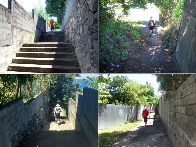 La randonnée débute aux Calbanons de la Cafrine où un parking peut accueillir quelques véhicules. Les bâtiments réhabilités sont le plus souvent fermés, sauf la maison musée (Photo 1). Si le départ a lieu aux aurores, garder la visite du lieu pour la fin de la boucle. Prendre à droite le Chemin Maxime Rivière et marcher jusqu'au grand rond-point et à l'échangeur de la RN2 (Photo 2). Poursuivre jusqu'au prochain rond-point et atteindre le littoral par la rue Bertin Lauret. La côte très rocheuse et les vagues qui s'y écrasent constituent un agréable spectacle, plus vivant que les cannes à sucre traversées plus tard (Photo 3). Des aires de repos ombragées ont été installées. La marche peut s'effectuer au plus près de la falaise (Photo 4). Au lieu d'emprunter le Chemin Irénée Courtois de la course, poursuivre sur le sentier littoral entre chocas et propriétés (Photo 5). Il se termine au parking de l'hôtel. Partir à gauche pour marcher cette fois sur la route principale. Après la boucherie et le marchand de légumes, partir sur la droite sur l'allée de la Source. Elle se finit à un lieu prisé des baigneurs. Lors de la baignade, on sent l'eau fraîche surgir avant de se mélanger à l'eau salée du bassin (Photo 6). Il est possible, un peu plus loin, de revenir vers les vagues par la Ruelle de l’École mais il faut sortir assez rapidement par une allée entre les habitations. Elle est privée d'après une habitante mais pas interdite (Photo 7). Après cet écart facultatif, poursuivre vers la plage. On parvient très vite au bassin de baignade, minuscule et ensablé au milieu des rochers (Photo 8). Ne pas manquer les extraordinaires banians du terrain Paddock avec leurs interminables racines dans lesquelles jouent les enfants durant les pique-niques (Photo 9). L'endroit tient son nom des écuries de l'usine au 19ème siècle. Longer la plage surchauffée sur un trottoir envahi par endroits de patates à Durand (Photo 10). Les randonneurs intéressés par la visite du puits poursuivront vers le Cap Guillaume en marchant sur la plage en hors sentier (Photo 11). Après une zone agréable sur galets et corail, passer une série de gros rochers et guetter sur la gauche le bâtiment bétonné recouvert de cactus pitayas (Photo 12). Une fois le "blockhaus" repéré, emprunter le sentier remontant vers les maisons. Sur la droite, un petit passage envahi permet de rejoindre le puits couvert par un ouvrage à l'architecture élaborée. Des escaliers, goulottes, caniveaux amenaient l'eau au puits central, à sec depuis longtemps (Photo 13). La visite terminée, remonter vers l'Impasse Sallembert par un sentier de pêcheur étroit entre les clôtures (Photo 14). Une portion urbaine débute par la traversée d'Anse les Bas, un quartier calme de Grands Bois (Photo 15). Suivre quelques rues jusqu'au temple tamoul puis emprunter sur la droite un chemin qui remonte la colline en direction de la RN2. Il s'élève par des pentes faibles entre les friches en offrant de plus en plus de panoramas sur le village (Photo 16). On domine plus loin l'ancienne usine réhabilitée et la balance (Photo 17). Le chemin finit à la Rue Émile Hugo qui passe plus loin sous la déviation (Photo 18). Le Chemin Bassin Chevrette traverse un petit quartier avant de filer plein nord par des pentes un peu plus appuyées entre champs et vergers (Photo 19). Quitter la route pour emprunter une piste dans les cannes filant en direction du Piton de Mont Vert qu'on aperçoit à l'horizon (Photo 20). Partir sur la gauche aux prochaines habitations puis rapidement à droite pour retrouver les cannes à sucre (Photo 21). Aux maisons suivantes, repartir à gauche sur une petite route en direction du Chemin Grand Père sur la dernière pente de la boucle (Photo 22). Poursuivre entre de nouvelles habitations fleuries (Photo 23). La montée se termine. Suivre ce Chemin Grand Père, large et fréquenté par les véhicules. On longe des plantations de cocotiers, des champs de canne et des prairies (Photo 24). Peu de place sur les accotements pour éviter les véhicules roulant parfois rapidement (Photo 25). Après 15 minutes de descente, on se rapproche de la Ravine des Cafres les Hauts qu'on voit très bien après avoir passé les grandes serres maraîchères sur la droite (Photo 26). A la fin de la route, traverser le rond-point de la route de Montvert et récupérer, 50 m plus loin la Rue Jules Verne qui évite d'affronter l'importante circulation (Photo 27). Il faut parfois retrouver la RD29 sur quelques dizaines de mètres pour reprendre des ruelles et surtout des raccourcis sous forme d'allées ou d'escaliers pour marcher à l'ombre et dans le calme (Photo 28). A la fin de l'Allée des Pois de Senteur, traverser la RD29 puis rejoindre les calbanons par les rues des Terrasses et du Coteau. Continuer jusqu'au temple avant de prendre quelques minutes à la visite des Calbanons de la Cafrine.