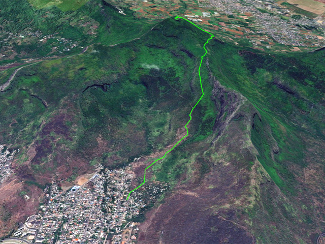 La randonnée débute au quartier Bangladesh. Stationner aux alentours de Pouce Street puis rejoindre à pied le début du parcours en frôlant quelques modestes cases (Photo 1). Une fois cette première centaine de mètres peu incitatifs, on se retrouve sur un chemin grimpant en pente douce en direction du Pouce sous quelques grands arbres (Photo 2). Les roches sont peintes en blanc pour confirmer le bon itinéraire. Le manque d'entretien par endroits a facilité l'implantation de grandes herbes et autres plantes. On longe la chaîne du Snail Rock sur la droite. Jamais la montée n'est difficile (Photo 3). Après une vingtaine de minutes, on parvient à une bifurcation marquée par quelques panneaux qui indiquent distances et temps de marche (Photo 4). Prendre à droite du panneau et délaisser le sentier de gauche. La montée au Pouce débute dans des sous-bois très touffus envahis de lianes papillon assombrissant fortement le parcours (Photo 5). Ces lianes sont si touffues qu'il est impossible d'y repérer un sentier qui les traverserait. La marche s'effectue sur des lits de feuilles mortes en évitant les pierres et roches encombrant le sentier (Photo 6). Il n'y a pas à réfléchir pour trouver son chemin. La montée est régulière entre de hautes haies de lianes et des bosquets de goyaviers (Photo 7). Une demi-heure après la bifurcation, le chemin s'éclaire en arrivant aux premières clairières. On aperçoit enfin l'horizon et les pitons entourant Port Louis (Photo 8). Le sentier oblique sur la droite. Le sol est désormais recouvert de longoses à perte de vue. On ne les quittera guère jusqu'au sommet (Photo 9). La suite de la montée est facile dans une végétation qui a changé. Les palmiers se multiplient et les califons bordent le sentier parfois humide (Photo 10). On a gagné en altitude donc en panoramas sur les montagnes et villes du centre (Photo 11). On s'est élevé de 500 m depuis le départ et la ville de Port Louis a rapetissé (Photo 12). On s'approche très vite du sentier le plus utilisé depuis Moka. Le Pouce est désormais bien visible au-dessus des longoses (Photo 13). Fini l'étroit sentier, humide ou caillouteux. On entame cette dernière montée sur un large parcours usé par les dizaines de marcheurs quotidiens (Photo 14). Quelques promontoires rocheux du côté de Moka permettent d'apercevoir le parking et de mieux comprendre pourquoi les randonneurs sont plus nombreux à venir de là, la distance est plus courte (Photo 15). Par beau temps, profiter des vues dégagées sur une bonne partie de l'île (Photo 16). Tout en repérant le prochain promontoire, repartir à l'assaut du Pouce en longeant la falaise (Photo 17). La montée s'intensifie légèrement. De nouveaux sentiers parallèles ont été créés lorsque l'affluence est forte (Photo 18). La profondeur de la terre creusée témoigne de l'intérêt que portent les randonneurs à ce sommet (Photo 19). On voit de mieux en mieux les grimpeurs sur l'arête (Photo 20). Ne pas manquer la longue chaine montagneuse qui abrite le très caractéristique Pieter Both (Photo 21). Après un dernier petit plateau donnant sur le nord, entamer la montée dans les longoses et goyaviers (Photo 22). Très vite, on parvient à de véritables murs, parfois glissants. Il faut s'aider des mains pour les franchir (Photo 23 et 24). Sur la droite, une grande forêt abrite des singes. Ne pas hésiter à observer la cime des arbres pour tenter de découvrir les macaques crabiers qui se délectent des fruits (Photo 25). La fin de l'ascension est tout aussi éprouvante, surtout pour les randonneurs occasionnels (Photo 26). Une fois au sommet, les difficultés prennent fin, du moins pour un temps. On peut à loisir observer les points caractéristiques de l'Île Maurice, même si aucune table d'orientation n'y est installée (Photo 27). Le sommet est encombré de roches mais assez plat pour ne courir aucun risque (Photo 28). Entreprendre la descente par le même sentier en prenant garde aux parties verticales et humides. Si un véhicule a été prévu à Moka, il est possible d'y redescendre une fois atteint le croisement. Sinon, reprendre l'itinéraire emprunté à l'aller et regagner le quartier de Bangladesh.
