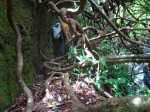La randonnée débute au réservoir de la Nicolière. Visiter les installations et les abords avant de se lancer dans cette courte aventure. Voir si nécessaire la fiche sur la première partie de cette boucle. La marche s'effectue totalement à plat le long du canal alimentant le réservoir. On le longe parfois lorsqu'il n'est pas couvert de béton (Photo 1). Cette promenade n'est pas assez difficile pour préparer la remontée sportive du torrent et de ses cascades (Photo 2). Après 2 kilomètres de promenade, on parvient à une passerelle canal enjambant une ravine, affluent de la Rivière des Remparts. Le Jamblon Bridge débute sous les jamrosats bordant la ravine (Photo 3). Son franchissement comporte quelques risques si les jambes flageolent. Prendre garde là où il n'y a plus de rambarde et éviter même de s'appuyer sur celle en place (Photo 4). De l'autre côté, poursuivre un peu le long du canal jusqu'à ce que celui-ci oblique à gauche. Trouver dans le sous-bois un petit sentier discret partant sur la droite. Peu fréquenté, il est cependant facile à deviner. On parvient en quelques minutes au ruisseau où l'on rencontre les premiers captages (Photo 5). Rester au plus près de l'eau et rejoindre la première chute de la montée. Elle fait moins de 10 m et ne possède pas de bassin. Pas de sentier pour la contourner. Il faut repérer la corde en rive gauche et se hisser à la force des bras (Photo 6). On tombe immédiatement sur une autre chute se contournant en rive droite (Photo 7). La trace sur la berge est discrète mais on peut toujours la suivre à l'instinct. Elle mène à une troisième petite cascade protégée par un arbre qui empêche de s'en approcher facilement (Photo 8). Le contournement, toujours en rive droite, passe entre d'énormes lianes papillon qui obligent à se contorsionner en prenant garde à ne pas glisser vers la cascade (Photo 9). Plus haut, la prochaine est un haut toboggan tombant sur des roches basaltiques (Photo 10). Là également, la poursuite vers l'amont est une aventure au milieu des lianes grosses comme des cuisses, sur un sentier glissant et très étroit (Photo 11). La cinquième cascade est assez esthétique, mi-chute, mi-toboggan dont une partie file dans un tuyau de prise d'eau (Photo 12). L’échappatoire est aussi sportive que pour la première. Heureusement une corde permet de passer l'obstacle abrupt (Photo 13). Après un très court cheminement, on arrive à la cascade n°6, aussi discrète que les autres (Photo 14). La prochaine n'est pas comptabilisée puisque c'est l'écoulement d'un petit barrage de recueil (Photo 15). D'anciens barbelés et une porte symbolique, départ d'un sentier d'entretien, indiquent que le lieu fut sans doute protégé à une certaine époque (Photo 16). A partir du barrage, le sentier est difficile à suivre ou disparaît. Poursuivre donc par le torrent, marcher le plus souvent dans l'eau en prenant garde aux roches glissantes (Photo 17). On arrive plus haut sur le seul véritable bassin de la journée où l'eau très fraîche ne rebute pas tous les randonneurs (Photo 18). Après le bassin, on poursuit la montée en direction de la septième chute. Il s'agit en réalité de la source du ruisseau surgissant d'un petit tunnel caché dans la végétation (Photo 19). L'eau est encore plus fraîche que dans le bassin (Photo 20). La montée au petit tunnel est assez acrobatique. Poursuivre vers l'amont en partant sur la droite pour affronter une rude montée sur d'anciens éboulis instables où le pied a vite fait de glisser (Photo 21). Au passage, remarquer la grotte qui doit abriter les singes lors des forts épisodes pluvieux (Photo 22). Après l'éboulis, on retrouve un sentier classique sur les racines et l'on arrive dans une partie boisée (Photo 23). Le sentier, plus fréquenté, permet aux habitants de se rendre à la source et peut-être au bassin (Photo 24). La traversée de la forêt, presque plate, se fait facilement après l’effort de la montée (Photo 25). On entend passer les véhicules sur la B49 et on quitte bientôt le couvert des arbres (Photo 26). La circulation est variable en fonction des jours de la semaine. Prendre à droite et entamer la longue descente des deux lacets sur une large route, agréable dans la belle forêt (Photo 27). Il n'y a pas de raccourcis pour rejoindre la route en coupant les lacets. La descente se termine dans un véritable tunnel végétal créé par les jamrosats penchés (Photo 28). On rejoint le parking où des vendeurs proposent rafraîchissements et fruits afin de terminer cette boucle sereinement et oublier les efforts de la montée de ravine.
