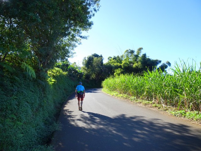 La randonnée débute ici à la poste de Piton des Goyaves proposant un lieu de stationnement. Partir à droite sur la rue des Platanes en direction de Petite Ile et passer quelques virages en changeant fréquemment de côté pour toujours être sur un trottoir (Photo 1). En fonction des horaires la circulation est plus ou moins importante. Lors de cette traversée urbaine, profiter de plusieurs points de vue en direction de la mer et du Piton de Mont Vert (Photo 2). Après 1000 m à plat, repérer l'arrêt de bus "Rue des Platanes" et emprunter la piste qui débute 20 mètres plus loin. Entamer une longue montée sur une piste parfois défoncée par les roues de tracteurs avec, par endroits, des portions glissantes (Photo 3). La montée de moins de 200 m est presque rectiligne sur une pente constante. La végétation comporte beaucoup de faux poivriers quand ce ne sont pas les cannes qui bouchent un peu la vue. Le Piton de Many, sur la gauche, presque plat, n'est guère impressionnant avec ses 790 m (Photo 4). Après 20 minutes de cette piste terreuse on parvient à des champs et des vergers sans arbres pour cacher les paysages (Photo 5). La piste se termine à l'Allée des Artichauts. Poursuivre à gauche à travers les premières prairies sur la petite route ouvrant de larges horizons. Les premiers troupeaux de vaches limousines font leur apparition. Peu habituées aux randonneurs, elles les regardent passer avec curiosité (Photo 6). A 850 m, les habitations sont très rares hormis quelques fermes. Les prairies et petits bois représentent l'essentiel de la verdure. Les panoramas sur le Dimitile, le Cirque de Cilaos et les grands sommets sont très agréables (Photo 7). On retrouve quelques champs et donc moins d'élevages par endroits (Photo 8). Après le Chemin du Piton des Goyaves, délaisser la route puis partir à droite sur une piste presque plane entre poivriers et longoses (Photo 9). Franchir le discret Bras de Mont Vert que l'on retrouvera, beaucoup plus joli, quelques hectomètres plus bas. La piste repart vers l'ouest, traverse de grands vergers d'agrumes avant de rencontrer plus bas la Route du Site (Photo 10). On conserve de superbes panoramas sur les sommets tout en cheminant sur une petite route étroite entre prairies et champs (Photo 11). Très près sur la droite coule le Bras Sec également bordé d'élevages bovins (Photo 12). La route, en légère descente, délimite de grandes prairies (Photo 13). Après le dernier grand virage, on arrive à nouveau au Bras de Mont Vert. Les très hauts talus sont couverts de splendides jamrosats qui tiennent malgré d'imposantes racines à l'air libre (Photo 14). La ravine a grossi depuis le dernier gué et l'eau coule une partie de l'année (Photo 15). On entend couler de l'eau vers l'aval. Quitter la route pour se rapprocher des trois petites chutes qui terminent au bas d'un cassé difficile à franchir (Photo 16). Poursuivre sur la Route du Site en longeant le bras qui semble très difficile à atteindre au fond d'un véritable canyon très verdoyant (Photo 17). La route se finit au village des Chênes. Poursuivre à gauche. Très vite, le Chemin Terre des Chênes ramène à la RD3 et la boucle pourrait prendre fin. Pour éviter ce retour trop urbain, reprendre à gauche le Chemin Acquier puis redescendre par le Chemin Elly Fontaine au milieu de quelques habitations et beaucoup de champs de canne (Photo 19). Cette dernière rue finit également sur la RD3 que l'on s'empresse de quitter pour remonter par l'allée des fougères, toujours dans les mêmes paysages. Ne pas manquer, sur la droite, le discret panneau vieillissant annonçant le Site Vivier (Photo 20). Marcher vers de grosses touffes de bambous sur une piste gazonnée. L'endroit servant de décharge a été reprise par l'association Pays d'Accueil du Sud Sauvage. Remis en état, il propose de belles balades ombragées et un parcours sportif. Une large piste descend en direction de la Ravine Vivier (Photo 21). Dans le premier virage, il est possible de poursuivre sur cette piste ou de partir en direction de la source (Photo 22). Près de la source, plusieurs panneaux accueillent les marcheurs et les sportifs (Photo 23). Poursuivre vers le stade du village qu'on aperçoit à la fin du large chemin ombragé (Photo 24). Afin de rallonger un peu la boucle, emprunter le sentier qui descend vers la Ravine Vivier. Remonter le petit cours d'eau par un des sentiers aménagés par l'association (Photo 25). Poursuivre dans la verdure en direction des touffes de bambous et de la source (Photo 26). Retrouver le chemin du stade et continuer vers la droite. Au stade, partir à gauche sur le sentier qui longe le grillage en profitant des dernières vues sur la côte vers Saint-Pierre (Photo 28). Rejoindre la RD3 puis la poste en obliquant à gauche.