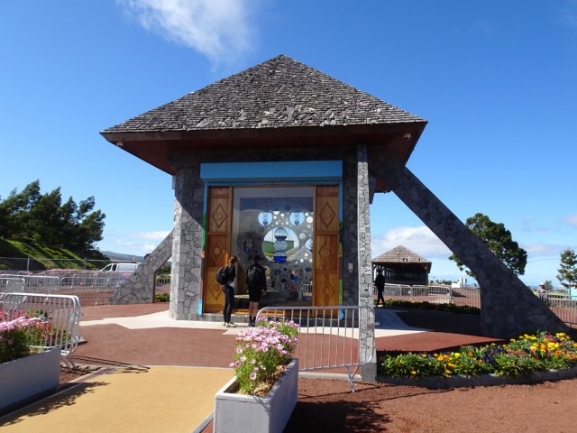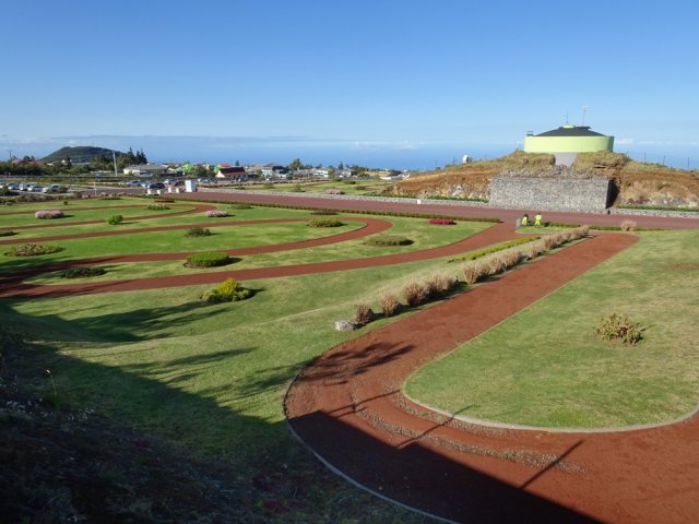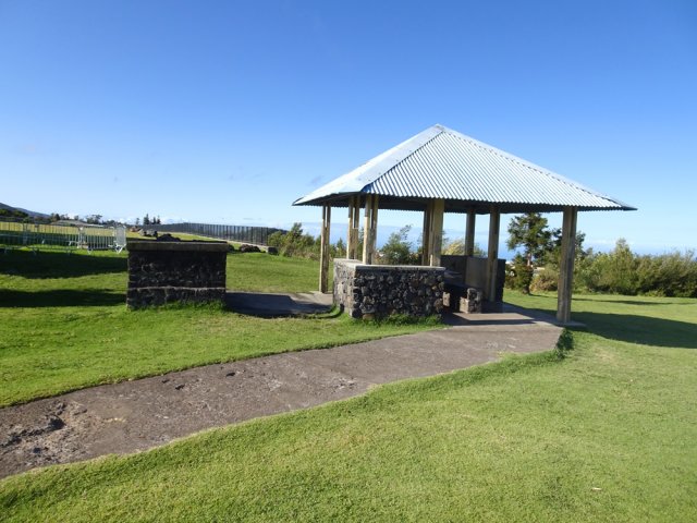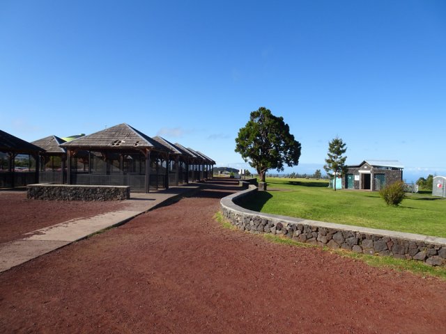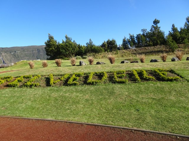 La "randonnée" débute sur un grand parking très bien aménagé à l'entrée du complexe touristique. De très nombreux emplacements sont réservés à l'entrée de l'aire (Photo 1). Rejoindre la première allée constituée de terre battue, bordée de belles pelouses bien tondues (Photo 2). Il est conseillé de visiter le lieu avant le passage d'un cyclone qui mettra à mal ce revêtement comme on l'a vu pour le circuit de Grande Anse . Récemment planté, l'espace ne cache jamais l'horizon (Photo 3). Suivre les allées qui vont et viennent par d'agréables lacets arrondis (Photo 4). Ne pas emprunter la courte pente en arrivant au château d'eau car elle finit en lisière, obligeant à faire demi-tour. Rejoindre alors le réservoir en filant tout droit vers l'allée principale (Photo 5). Cette large allée, un peu plus caillouteuse, n'empêche pas le passage des roues. L'endroit est très fleuri (Photo 6). Garder la visite des kiosques des commerçants en fonction de l'heure ou après la visite. Rejoindre l'horloge à eau. Hors des heures ouvrables, le local est fermé (Photo 7). Lorsque le belvédère s'ouvre aux visiteurs, l'horloge est alors visible (Photo 8). Il est intéressant de s'approcher du mécanisme hydraulique enfermé dans sa cage en verre pour tenter de deviner l'heure. La précédente clepsydre comportait des tuyaux de tous côtés. Celle-ci est principalement constituée de globes en verre reliés entre eux où s'écoule une eau bleue mélangée à de l'alcool (Photo 9). Une fois l'heure décryptée, se rapprocher du belvédère, gardé et surveillé, contrairement au précédent qui était libre d'accès. Le spectacle est au rendez-vous. Si les vitres peuvent impressionner, c'est surtout le paysage entourant Grand Bassin qui a le plus de succès (Photo 10). Le vide sous l'édifice est peu impressionnant en raison des rochers tout proches. En revanche, Grand Bassin paraît vertigineusement loin (Photo 11). Par temps sec, on voit très bien le paysage sous les grandes vitres épaisses (Photo 12). Sous la pluie, le spectacle doit rester banal. Le temps n'est pas compté ; on peut rester autant que l'on désire. En se penchant au-dessus de la rambarde, on voit tout aussi bien le village tel qu'on l'apercevait avec l'ancien belvédère (Photo 13). La vallée du Bras des Roches Noires et toujours aussi impressionnante (Photo 14). Une fois la visite terminée, se diriger vers les commerçants s'ils sont présents. C'est surtout en fin de semaine que l'affluence est la plus importante. L'allée bétonnée est de plus en plus recouverte de scories mais elle est certainement balayée régulièrement. (Photo 15). Si un cari est prévu à l'ombre d'un kiosque, obliquer à droite à la première petite allée. Elle mène tout d'abord aux toilettes publiques (Photo 16). Si tous les kiosques sont entourés de pelouse, deux ont été laissés aux fauteuils roulants (Photo 17). Ils sont larges et peuvent accueillir une famille complète proche d'un barbecue (Photo 18). Les paysages alentour donnent vraiment envie d'y rester le temps d'un cari (Photo 19). Le repas terminé, revenir aux commerces séparés par une large allée bétonnée (Photo 20). Partir sur la droite pour emprunter une nouvelle allée sinueuse dans le même type de paysage qu'en venant (Photo 21). Il sera fréquent, durant cette traversée, de croiser des randonneurs qui filent tout droit au départ du sentier de Grand Bassin (Photo 22). Se retourner une dernière fois pour admirer les coteaux dominant Grand Bassin (Photo 23) puis les pelouses bien entretenues (Photo 24) avant de regagner le parking tout proche.