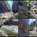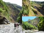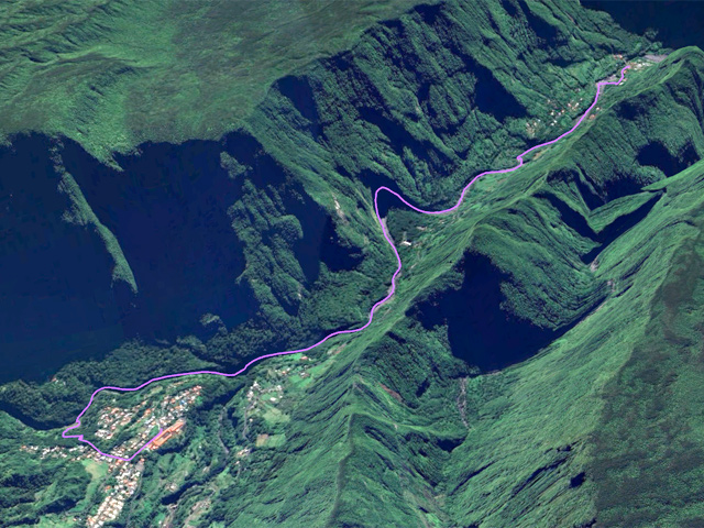 La randonnée débute à Bois de Pomme, ici en face de l'école du village. Si le voyage s'effectue en bus, il faudra marcher depuis Salazie sur moins de 2 km à moins de trouver ces petits bus desservant Bois de Pomme. Rejoindre le sentier de l'Îlet Fleurs Jaunes en empruntant quelques courts tronçons de rues. Le sentier débute à plat avant de plonger au niveau d'un élevage de biquettes. Après les lacets, très difficile de retrouver le sentier qui rejoint le barrage entre les énormes bambous, les bringeliers et longoses. Il faut descendre à l'azimut ou alors oser la petite route se terminant à la rivière (Photo 1). On atteint rapidement le dernier lacet de cette route (Photo 2). Aucune difficulté pour descendre jusqu'à la rivière 10 m plus bas. La descente de rivière peut débuter pour 3 heures. Ne pas chercher à éviter l'eau et effectuer les premières traversées en mouillant les pieds (Photo 3). On parvient en moins de 10 minutes à une petite chute entourée de grosses roches pour les premières acrobaties (Photo 4). Les falaises humides et colorées de l'étroit canyon sont infranchissables en cas de retour forcé (Photo 5). 10 minutes plus tard, nouvel écueil qui oblige de descendre un rocher deux fois plus important que le précédent avant de continuer en passant sous un énorme rocher (Photo 6). Poursuivre dans des paysages de plus en plus beaux de canyons étroits sans forcément avoir besoin de marcher dans l'eau (Photo 7). Après 45 minutes de descente depuis le barrage, le passage le plus sportif des Fleurs Jaunes se présente. Un tronc coincé par les crues peut tenter les plus hardis. Les autres prendront garde à ne pas chuter dans la cascade très glissante mais heureusement très courte (Photo 8). En résumé, les points de passages délicats ne comportent pas de gros dangers tant que le niveau de l'eau est faible (Photo 9). Voilà pourquoi il est impératif de connaître ce niveau avant de se lancer dans l'aventure. Continuer facilement entre les parois en cherchant toujours le meilleur passage sur les galets ou plaques basaltiques (Photo 10). Un passage étroit a permis à l'eau de s'accumuler à la sortie en créant un grand bassin. En rasant la paroi on a toujours pied, mais la chaleur aidant peut encourager à passer plus vite en nageant (Photo 11). Il faut compter une bonne heure de descente pour atteindre le confluent de la Rivière du Mât. Ce coin sauvage et très rocheux a déjà été pratiqué pour une randonnée à la recherche de l'Îlet Micot. On y retrouve la corde qui pend près de son gros rocher en équilibre instable (Photo 12). Un abri sous un de ces rochers permet de se reposer à l'ombre. Il est également possible de remonter un peu la Rivière du Mât avant d'être bloqué par une petite cascade. Après cette halte débute la descente de la Rivière du Mât (Photo 13). La rivière, la plus importante du cirque, a besoin d'un canyon plus large pour couler (Photo 14). Les endroits traversés n'ont rien à envier à ceux de la rivière précédente. On retrouve les falaises infranchissables et les bassins qu'il faut constamment traverser (Photo 15). Un peu plus en aval, elle devient plus tumultueuse et il est préférable de marcher en rive gauche sur les basaltes. On peut rencontrer ainsi une vierge sous une avancée en rive gauche et une belle source surgissant de la falaise en rive droite (Photo 16). Les amateurs apprécieront particulièrement un superbe canyon dans un virage de la rivière (Photo 17). Plus bas, dans un grand coude de la rivière, on frôle l'Îlet Morin qu'on devine sur le plateau en rive droite mais surtout aux falaises laissées à nu par le grand éboulis de septembre 2010 (Photo 18). Les parois sont recouvertes de bambous nains (Pogonatherum paniceum) et de quelques cascades en période de pluie. A partir de cet îlet, le lit s'élargit et la marche s'effectue sur des hectares de galets de toutes tailles (Photo 19). La Ravine la Faim est facile à repérer à la longue cascade terminant sa chute dans la rivière (Photo 20). Ce magnifique endroit donne une nouvelle occasion d'une halte reposante (Photo 21). Plus bas, en se retournant, on peut distinguer la cascade la Faim, laissée aux professionnels (Photo 22). Le courant redevient plus fort en arrivant dans une zone de plus en plus étroite et chaotique (Photo 23). Les plus intrépides tenteront une descente de la rivière mais l'endroit s'avère dangereux en raison du courant. Il est préférable d'escalader les roches en rive droite et d'emprunter les voies les plus instinctives pour revenir dans l'eau en prenant garde aux glissades (Photo 24). Le fougueux torrent se calme immédiatement après le goulet et l'eau peu profonde ne gêne pas la marche (Photo 25). La suite est une formalité entre des rives qui s'espacent à nouveau, recouvertes de forêts à la hauteur de l'îlet de l'Escalier (Photo 26). La rivière peu profonde et les berges lisses permettent de trouver son itinéraire selon ses goûts (Photo 27). La remontée au parking étant impossible ou très difficile au niveau du pont, ne pas manquer le sentier débutant après une grande case sur la droite dotée d'un petit kiosque sur la rive. Au moment où il est possible d'apercevoir le pont (Photo 28), trouver le petit cairn qui marque le début de la montée en rive droite. Ce sentier de pêcheur, étroit et glissant, se termine à la route de Salazie après quelques très hautes marches en béton. A moins de poursuivre vers le village de la Rivière du Mât, partir à gauche sur la route pour terminer à la petite chapelle de l'Escalier.