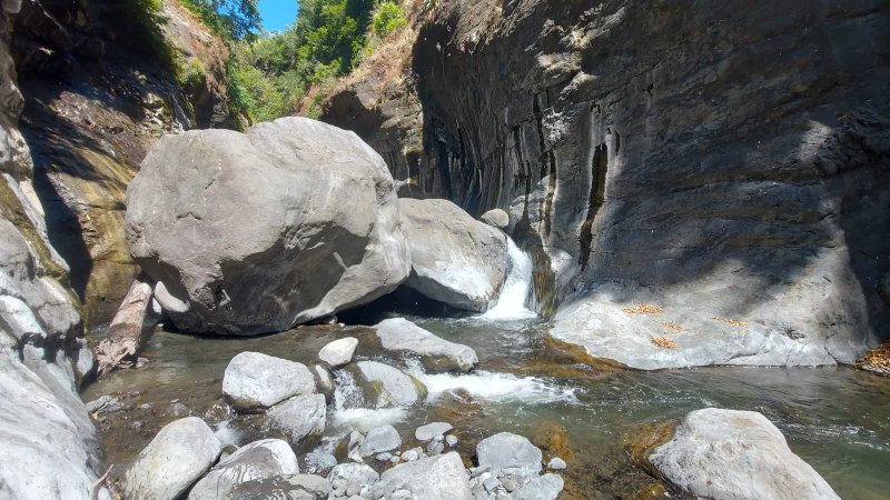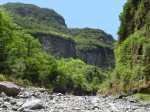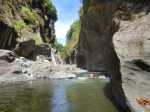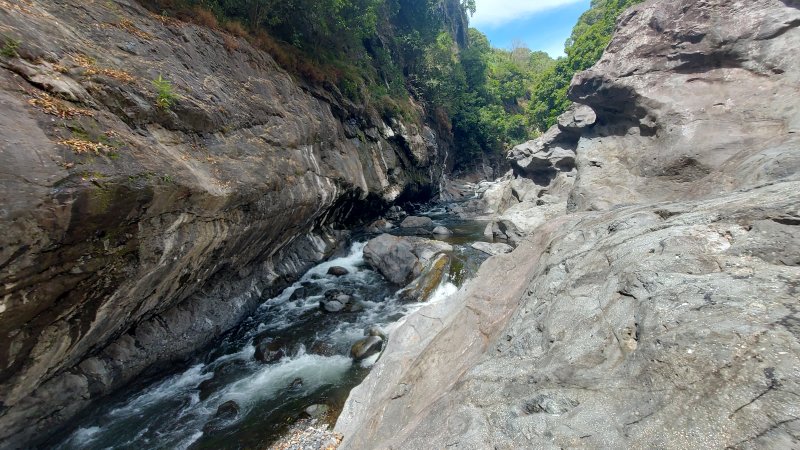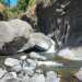 Tous les randonneurs n'apprécient pas forcément de marcher plusieurs heures dans des fonds de ravines. Il faut se mouiller les pieds, les glissades sont fréquentes, les galets roulent sous le pied ou des pierres peuvent dégringoler des falaises souvent abruptes des canyons. Les amateurs de l'exercice apprécieront cette nouvelle sortie aquatique, courte mais sportive en raison de certains passages délicats ne nécessitant cependant pas de matériel. Le départ s'effectue en aval du barrage des Fleurs Jaunes à Bois de Pommes. Il est possible de poursuivre jusqu'à la mer ou au village de la Rivière du Mât si on est peu nombreux et qu'on dispose d'une longue journée. La partie du pont de l'Escalier a déjà été présentée sur une randonnée les pieds dans l'eau dans des paysages moins attrayants que ceux proposés sur cette fiche. La Rivière des Fleurs Jaunes est un joli torrent parfois fougueux se faufilant dans de superbes canyons étroits. Celle du Mât propose de magnifiques paysages même si la vallée peut être plus large par moments. Le seul point noir se situe au départ. Un sentier encore bien marqué sur la carte relie le sentier de l'Îlet Fleurs Jaunes au barrage mais il a beaucoup souffert des cyclones et poussées de végétation. Il est donc réservé aux randonneurs aguerris habitués aux hors sentiers. Nous l'avons pourtant emprunté mais il est aussi possible de braver quelques interdits et d'utiliser la petite route, comme le font les pêcheurs. Toute la sortie peut s'effectuer sans nager mais difficile d'y échapper si la chaleur incite au rafraîchissement.