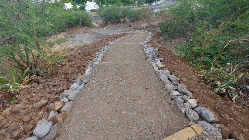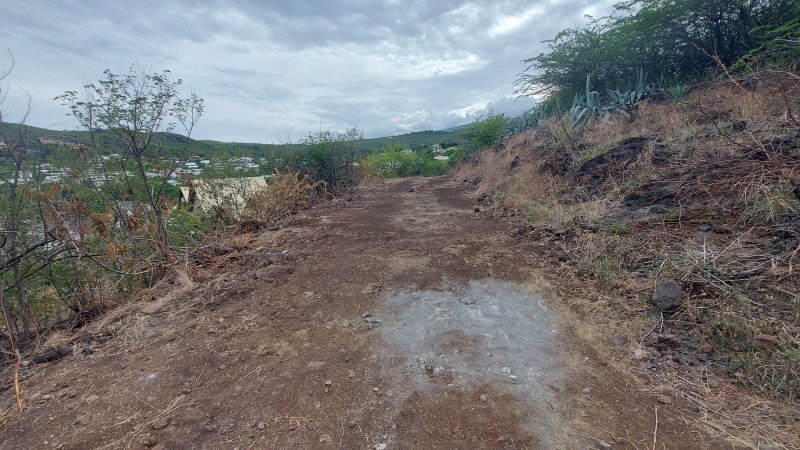 La randonnée débute ici à l'église Notre Dame de la Paix de Saint-Gilles où quelques emplacements de stationnement ombragés sont très vite assaillis par les visiteurs du port. L'édifice domine la mer depuis une petite colline bordant l'océan (Photo 1). Partir vers l'est par la rue Mgr Maunier bordée de quelques immeubles et de superbes haies de bougainvilliers (Photo 2). La rue descend pour passer sous la RN1a (Photo 3). Un escalier sur la droite attire le regard. C'est par cet escalier que se terminera la boucle urbaine. Le Chemin Carrosse prend le relais. Il est bordé de jardins et de quelques oratoires remarquables (Photo 4). Ne pas manquer l'escalier évitant de longer la rue pour atteindre la Rue des Espadons (Photo 5). Continuer sur la Rue des Vivaneaux pour retrouver le Chemin Carrosse dans des lotissements calmes et fleuris. Au début de la Rue des Martins-Pêcheurs débute, sur la gauche, un chemin semblant privé où un panneau interdit à tout véhicule de pénétrer. Rien sur les piétons et quelques joggeurs qui arrivent en sueur lèvent le doute sur l'utilisation de la piste (Photo 6). Ce large chemin caillouteux serpente entre les épineux et offre quelques points de vue sur la mer (Photo 7). Sur la gauche une colline abrite le Théat Plein Air reconnaissable à ses pylônes de projecteurs (Photo 8). Les parties ombragées sont assez courtes (Photo 9). Franchir une petite ravine bordée de taros et poursuivre en faible montée le long de barres rocheuses envahies de chocas (Photo 10). A mi-pente, avant le prochain lacet, chercher le départ du sentier entre deux chocas. Il grimpe fort entre les faux mimosas (Leucaena leucocephala), heureusement dépourvus d'épines (Photo 11). Partir à droite sur la piste qu'on retrouve et marcher jusqu'au croisement de plusieurs pistes et sentiers dont ceux de gauche remontant vers la station de pompage de Moulin Kader. Laisser la piste caillouteuse de gauche pour débuter une belle partie champêtre par une nouvelle piste plus carrossable (Photo 12). On se retrouve entre des vergers sur le large chemin déjà foulé dans la randonnée remontant la Ravine St-Gilles. Cette vaste plaine, bien arrosée, donne des tonnes de fruits. Des grillages et caméras de tous côtés protègent les vergers d'éventuels "curieux". Ces hectares de pitayas, manguiers et même vigne pourraient donner certaines envies (Photo 13). C'est toujours entre ces clôtures que l'on s'approche de la RD100 (Photo 14). Rejoindre la route par la piste ou le raccourci créé par les coureurs puis longer le muret protégeant de la circulation. On a toute la ville de Saint-Gilles sous les yeux. On devine même l'église du point de départ (Photo 15). Plus loin, ne pas manquer le sentier partant sur la droite. Il est bien représenté sur les cartes IGN. On se retrouve dans une savane desséchée qui mène facilement vers le collège de Roquefeuil (Photo 16). La savane est remplacée par les jardins paysagers entourant le collège (Photo 17). Des escaliers le long des murs aident à trouver la rue Bianca (Photo 18). On traverse pour un temps les habitations de Roquefeuil. Marcher jusqu'au rond-point, le dépasser puis retrouver un nouveau sentier débutant sur la droite. Situé au plus près de la route il est, comme souvent, jonché de déchets sauvages laissés aimablement par les automobilistes de passage. Une fois passés pneus, batteries et bouteilles, il est tout aussi facile à suivre que le précédent mais bordé cette fois de zépinards (Acacia farnesiana) qui pourraient par endroit griffer les cuisses (Photo 19). Peu emprunté, il est un peu plus difficile à suivre sur les 50 derniers mètres mais ne représente aucunement une aventure. Il se termine à une allée bétonnée passant entre deux établissements d'accueil de qualité pour personnes âgées (Photo 20). Rejoindre ensuite un grand parc avec des kiosques. Écrasé par le soleil, il manque de verdure mais des trous attendent sans doute des arbres lors d'une période plus humide (Photo 21). De nombreuses allées permettent de se balader à l'envie et même de rejoindre un kiosque en hauteur pour un panorama sur la ville. Rejoindre la Ruelle Betina puis partir à gauche pour trouver facilement le début du parcours de santé. En cas de fatigue, poursuivre sur ce chemin et atteindre l'escalier repéré en début de boucle.