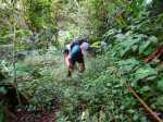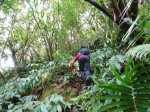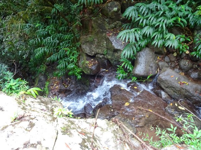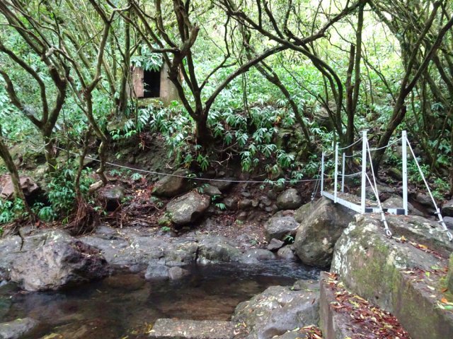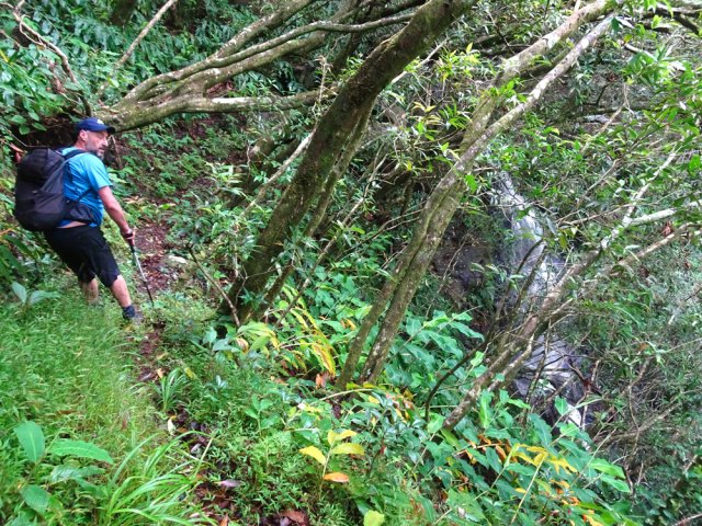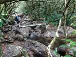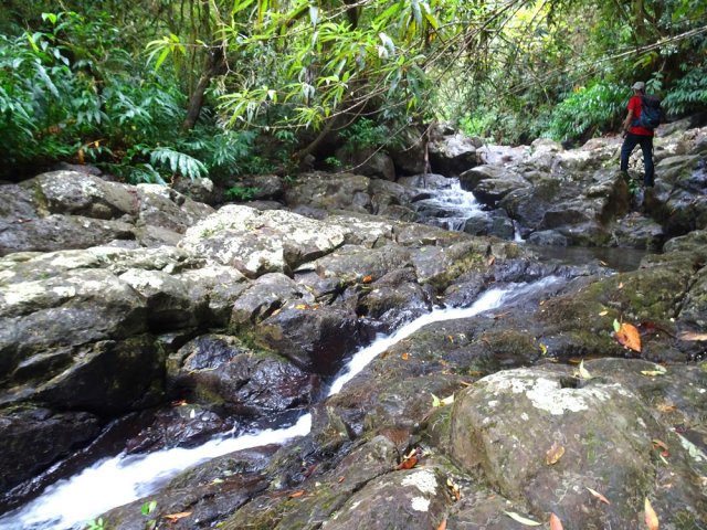 La randonnée débute sur la RD43 au plus près de la Ravine du Butor. Rejoindre le pont en profitant d'un point de vue sur Saint-Denis et la vallée de la ravine (Photo 1). La circulation n'est pas très importante et la distance très courte (Photo 2). Au pont, partir sur la droite en longeant le grillage qui entoure la citerne de 40 m3 destinée à récupèrer l'eau au sommet de la première cascade (Photo 3). Marcher un peu en rive gauche et traverser une première fois la ravine sur un gué sommaire comportant un long câble de maintien (Photo 4). On peut remonter la rivière jusqu'au pied de la première cascade. Sinon, trouver sur la gauche un sentier étroit qui attaque le rempart pour contourner la falaise (Photo 5). La pente est forte mais les nouveaux câbles facilitent la montée (Photo 6). Les longoses et les jouvences ont presque tout envahi. Une fois au point haut, le sentier entame sa descente en longeant le rempart très pentu et assez dangereux malgré la présence de nombreux arbres. On distingue la cascade à travers les futaies (Photo 7). La dernière descente est assez glissante sur les pierres luisantes mais les rambardes aident au maintien. La pente se termine à une petite passerelle qui doit être infranchissable lors des crues (Photo 8). Le torrent se précipite dans le vide. On peut voir le bassin depuis les rochers mais gare à la glissade. Pour plus de sécurité, oser descendre l'échelle fixée à la paroi et gagner une petite plateforme destinée à la maintenance des tuyauteries. On peut ainsi profiter de belles vues sur la chute en toute sécurité contre la barrière (Photo 9). Le système de récupération des eaux est simple. Quelques vestiges de la construction demeurent dans les longoses (Photo 10). Après cette première chute, entamer la remontée de la ravine en longeant tout d'abord un premier bassin (Photo 11). La marche s'effectue comme toujours en cherchant le meilleur passage entre ou sur les galets. On parvient assez rapidement à la deuxième cascade que l'on aperçoit de loin (Photo 12). La chute est agréable. Elle provient de deux bras de la ravine et remplit un beau bassin assez profond pour se baigner (Photo 13). Pour remonter vers le troisième bassin, il faut trouver l'étroit sentier qui remonte le rempart en rive gauche. Revenir sur ses pas et chercher le départ assez instinctif dans une cassure de la barre rocheuse envahie de racines, longoses et fougères (Photo 14). Pas de difficulté pour deviner la trace mais de gros efforts pour monter avec les mains cherchant branches et racines (Photo 15). Un gros fil électrique facilite grandement l'ascension (Photo 16). A la hauteur de la cascade, le sentier s'assagit mais reste toujours aussi étroit (Photo 17). On parvient sur la rive après une courte descente au milieu des longoses (Photo 18). On retrouve les deux embranchements repérés depuis le bas (Photo 19). La dernière cascade de la matinée se rejoint facilement en longeant des petits toboggans sur de larges plaques de basalte (Photo 20). La marche est donc rapide une grande partie du temps (Photo 21). On trouve bien évidemment les gros galets classiques des fonds de ravines (Photo 22). Le torrent est agréable, de minuscules chutes agrémentent la marche de leur musique aquatique (Photo 23). Les passages techniques sont rares et demandent peu d'efforts (Photo 24). On parvient assez vite au troisième bassin, aussi grand que les autres. Une petite chute l'alimente (Photo 25). Les falaises tout autour du bassin sont quasi verticales et il faut renoncer, à moins de trouver une trace de pêcheur, vraisemblablement en rive gauche. Faire demi-tour et reprendre le chemin inverse en faisant attention aux glissades (Photo 26). Après avoir utilisé le câble électrique et ses nœuds, on peut revenir à la ravine ou suivre un autre sentier en rive gauche et rejoindre le cours d'eau une cinquantaine de mètres plus loin. Franchir plus bas la passerelle puis longer les câbles avant de retrouver la citerne et la RD34.