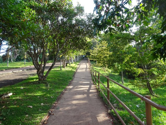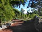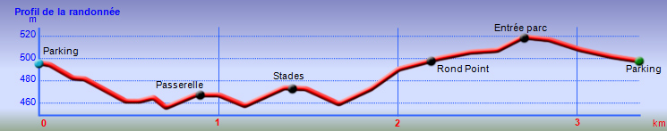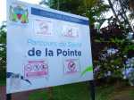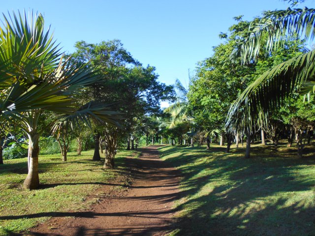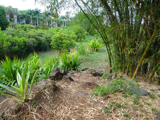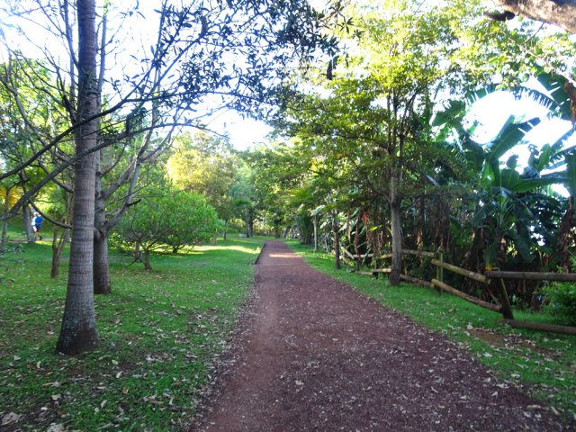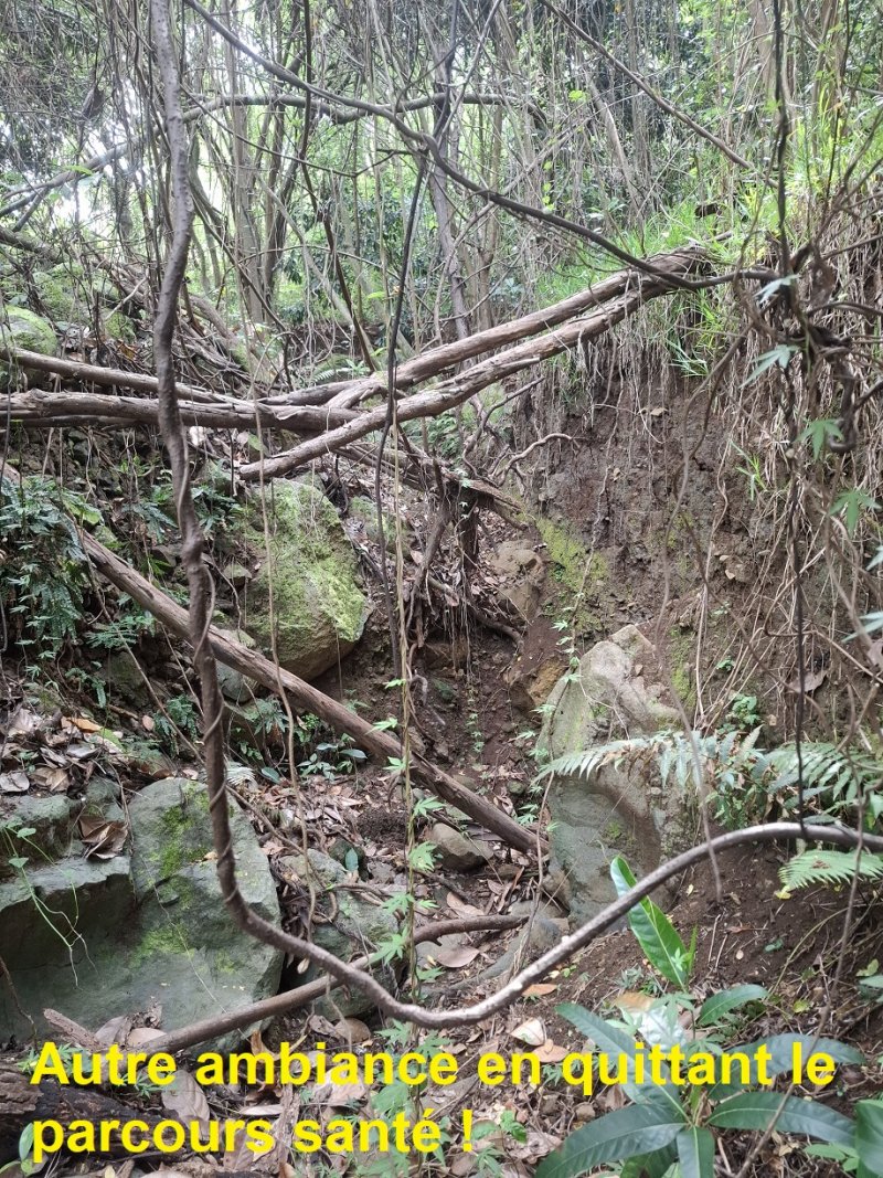 La randonnée débute au parking situé juste entre les deux parcs. Traverser la route et entamer le premier tour en passant devant le panneau d'accueil qui précise que les animaux sont interdits (Photo 1). Bien d'autres panneaux sont installés à l'entrée dont un qui recense quelques variétés d'arbres plantés autour des allées (Photo 2). Débuter par l'allée la plus proche de la Rivière d'Abord. On y rencontre déjà de nombreuses essences de bonne taille (Photo 3). En ouvrant l'œil, on en croisera d'autres qui étaient plantées bien avant l'installation du parcours de santé (Photo 4). On devine souvent la petite vallée de la Rivière d'Abord sur la droite. Parfois on a même des vues sur les bassins envahis de végétation, sans apercevoir un seul mètre du vieux sentier (Photo 5). La piste est toujours aussi agréable à l'ombre des palmiers (Photo 6). Tous les 100 m, un panneau donne la distance parcourue depuis l'entrée (Photo 7). Régulièrement, on se retrouve près d'obstacles du parcours mais rares sont les sportifs qui s'y éreintent (Photo 9 et 10). Après quelques lacets, le chemin traverse la petite ravine, affluent de la Rivière d'Abord (Photo 11). Le circuit repart naturellement vers la droite en longeant le talweg également envahi de hautes plantes (Photo 12). La piste monte un peu et frôle plus loin les 3 stades de la Pointe. Depuis les clôtures, on domine le parc boisé dans son ensemble (Photo 13). Il est possible de raccourcir le trajet en empruntant un des escaliers descendant vers la ravine (Photo 14). Un dernier virage emprunte une deuxième passerelle (Photo 15). Les pistes sont tellement rapprochées qu'on repasse à quelques mètres de celles empruntées à l'aller. Le circuit se termine par une pente bétonnée menant vers l'entrée du parc (Photo 16). C'est la seule difficulté de la boucle qui oblige à se pencher un peu vers l'avant. A la saison, les arbres à orchidées fleuris font oublier l'effort (Photo 17). On arrive sous de grands arbres proches d'une pelouse abritant de nombreux appareils de musculation (Photo 18). Plus loin, on s'approche de la route. Emprunter un petit sentier qui permet de rejoindre le Chemin de l’Établissement et le rond-point. Le Parc Marc Rivière débute aussitôt franchi le rond-point. Passer la chicane empêchant le passage des engins et entamer cette deuxième visite de jardin naturel. Une première courte boucle sur caillebotis commence immédiatement sur la droite pour traverser le Jardin des Sens, mais ramène très vite à la piste principale (Photo 19). Comme plus bas, le chemin de terre battue en pente faible longe de belles plantations qui mériteraient un panneau comportant leur nom (Photo 20). Elles existaient il y a quelques années mais ont certainement été vandalisées. On passe près de grosses touffes de bambous plantées bien avant la création du petit parc (Photo 21). On arrive bientôt à un portail fermé le week-end. On peut poursuivre dans le parc sur les pistes toujours aussi sinueuses (Photo 22). Pour éviter de passer deux fois au même endroit, il est possible, au portail, d'emprunter le sentier qui remonte vers le parking. On se retrouve ainsi devant la porte principale comportant un plan des lieux (Photo 24). Partir sur la droite pour passer devant les plantations d'endémiques puis les aromatiques (Photo 25). Plus loin, un alambic et quelques pieds de géranium symbolisent la culture de cette plante odorante. Revenir vers l'entrée et poursuivre sur la piste en traversant les plantes médicinales et quelques autres plantations (Photo 26). Une fois la première grille franchie, afin d'éviter de repasser au même endroit, remonter l'escalier sur la droite et longer la limite du parc. On retrouve des bambous et un sentier qui passe sur des enrochements (Photo 27). On traverse de nouvelles plantations d'endémiques puis le chemin redescend vers l'entrée Sud par un dernier virage (Photo 28). Le parking est à quelques mètres.