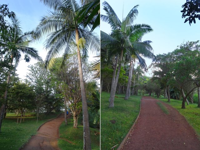 On voit souvent l'importance d'un lieu au parking qui lui est proche. A Bel Air, celui du Parcours de Santé de la Pointe est vaste mais il est souvent complet tant les tamponnais sont friands de ce havre de verdure le long de la Rivière d'Abord. Tôt le matin, les allées en terre battue sont prises d'assaut par les marcheurs ou les coureurs qui, en fonction de la forme ou du chrono, effectuent plusieurs fois le parcours sans avoir à se rendre dans une forêt de la région. Nous verrons à l'usage si le Parc des Palmiers pourra le détrôner. Le Parc Marc Rivière, tout proche, représente une bonne option en semaine pour rajouter du kilométrage en changeant un peu de paysage. Durant le week-end, seule la partie basse est ouverte au public. Un circuit permettait de rallonger encore plus en longeant la Rivière d'Abord mais, hélas, depuis la disparition de l'Association des Petits Tamponnais Ruraux, même les aventuriers ont délaissé les berges de basalte. Les randonneurs ne connaissant pas le Tampon pourront regrouper cette fiche avec le circuit du Parc des Palmiers, ce qui justifiera un long déplacement.