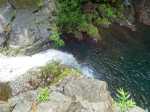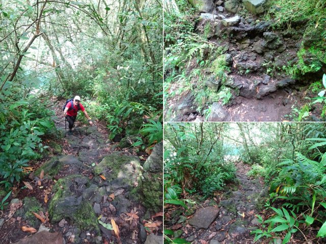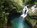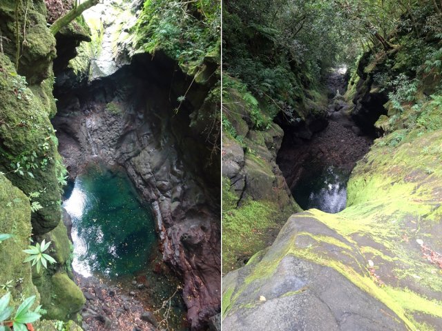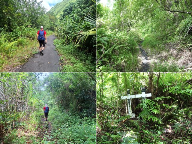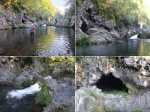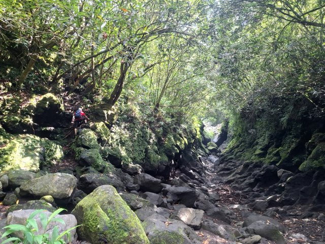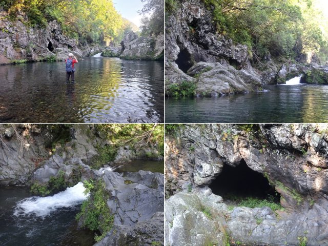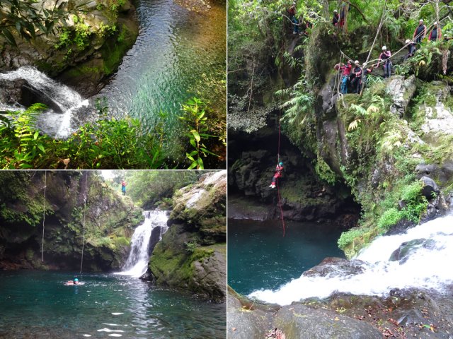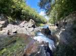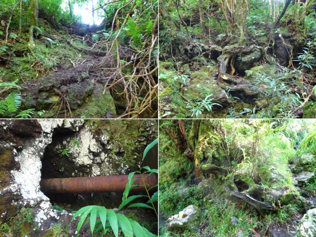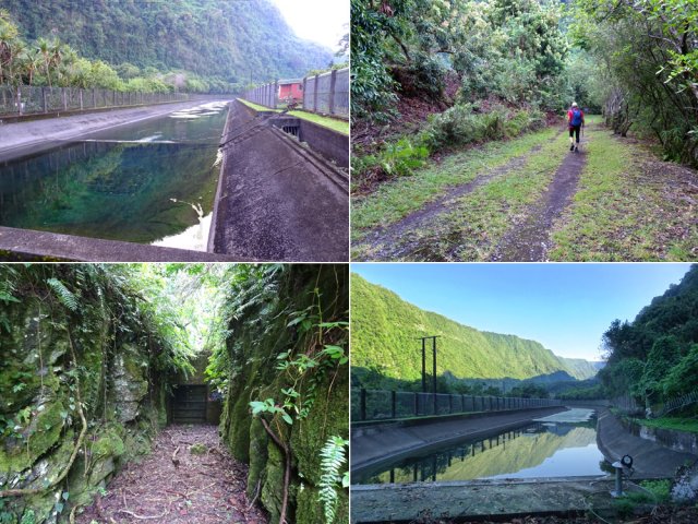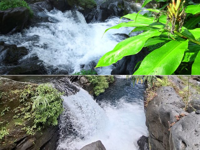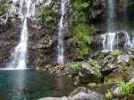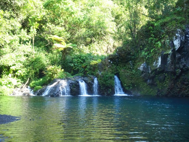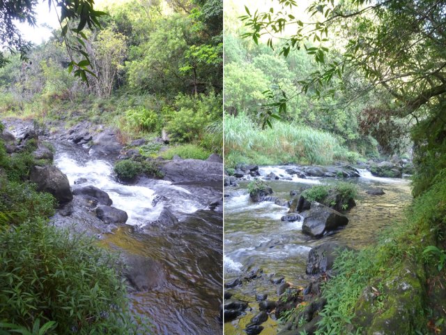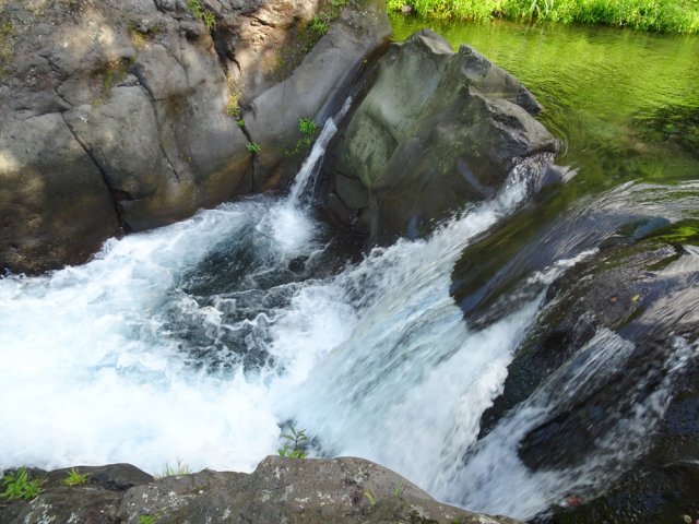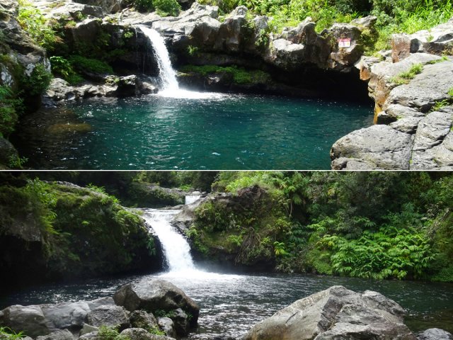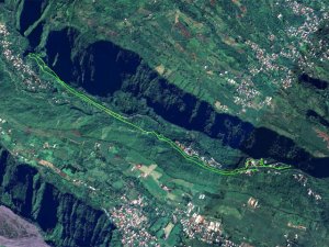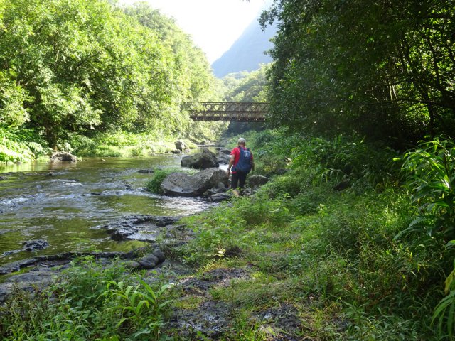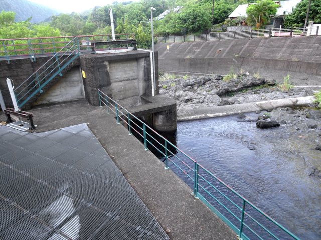 La randonnée débute au barrage situé dans le village de la Passerelle. L'endroit est protégé mais on distingue très bien le système de récupération d'une partie de la rivière pour alimenter le tunnel acheminant l'eau vers les turbines de l'usine hydroélectrique (Photo 1). Lorsque le niveau est bas, c'est toute l'eau qui est détournée. Avant d'entamer une remontée de la rivière, il est possible de se rendre un peu plus loin pour continuer l'étude du système. Prendre le Chemin du Tunnel débutant après la passerelle et rejoindre la retenue d'eau entourée de hauts grillages. Poursuivre sur un chemin jusqu'à l'entrée du tunnel et à la fin du réservoir (Photo 2). L'eau effectue 1700 m avant d'être précipitée par un tuyau vertical vers les turbines de la centrale. Reprendre le chemin inverse. Les amateurs d'urbex tenteront un écart vers l'ancienne école de la Passerelle, définitivement fermée suite à un important éboulis, avant de s'approcher de la chapelle du village (Photo 3). Continuer après la chapelle et retrouver le parking après une petite ruelle. Rejoindre la rive gauche de la rivière et entamer la courte aventure. Il est aisé de suivre le cours d'eau que l'on traverse très rarement. Quand des barres rocheuses rendent le cheminement difficile, emprunter les nombreux sentiers faciles à trouver en rive gauche (Photo 4). On rencontre le même type d'ouvrages repérés lors de la montée à la Cascade du Trou Noir (Photo 5). Depuis le sentier, il est possible de descendre, parfois de manière abrupte, jusqu'à la rivière (Photo 6). Après 15 minutes, on arrive à un vaste bassin peu profond bordé d'une grotte, alimenté par un court rapide passant sous une arche naturelle (Photo 7). Si la roche n'est pas trop glissante, il est possible de marcher sur l'arche pour atteindre l'autre rive pour un angle d'observation plus agréable (Photo 8). Retrouver le sentier puis marcher 2 minutes jusqu'au Bassin de Lucie, tout aussi vaste mais plus profond que le précédent (Photo 9). Ne pas hésiter à choisir le sentier le plus souvent possible en cas de roches humides et glissantes. On y trouve de belles racines et même des restes d'anciens travaux d'adduction (Photo 10). Plus haut, c'est un court bassin à remous, situé entre deux chutes, qui rend la baignade dangereuse (Photo 11). Retrouver le sentier en effectuant un très court demi-tour. On ne compte plus les sentes reliant la route à la rivière. On s'approche ainsi de la passerelle construite en 2011 suite à la fermeture de la route du Grand Défriché (Photo 12). Comme plus bas, préférer le sentier plutôt que les rives glissantes pour marcher en direction de la cascade du Trou Noir. Il est emprunté par les pique-niqueurs du dimanche recherchant des petites plages de sable gris et des lieux de baignade isolés (Photo 13). On frôle de profonds bassins faisant la joie des plongeurs avant de parvenir au bassin (Photo 14). En marchant dans les longoses et en prenant garde, on peut s'approcher de deux belles petites chutes en aval du bassin (Photo 15). Les eaux du bassin se prêtent mieux à la baignade lors du retour quand le soleil fait ressortir les belles couleurs turquoise. Passer en rive droite, se rapprocher de la chute latérale et grimper par le sentier rocheux qui domine la profonde vallée et se termine à la route de Grand Galet. Marcher quelques hectomètres sur cette petite route étroite qui offre de belles vues sur le Morne Langevin, avant de bifurquer sur piste de l'Îlet Sylvert (Photo 16). 50 m plus loin, elle traverse la rivière à sec. Emprunter le lit presque plat et trouver le cheminement le plus facile entre petits galets et renouées en tapissant le fond (Photo 17). En moins de 20 minutes, on parvient aux premiers cassés glissants qui se franchissent facilement (Photo 18). Le paysage change radicalement. On foule surtout du basalte luisant en frôlant des trous profonds. Un court sentier mène à une plateforme proche des vergers pour y repérer un agréable spot de bivouac très ombragé. Les jamrosats se multiplient le long des berges, créant de véritables tunnels de verdure. La rivière se rétrécit de plus en plus par un goulet trop glissant se terminant à un très profond bassin. Ne le pratiquer qu'en période sèche. Le contourner par le sentier escarpé des canyonistes en rive droite (Photo 19). L'effort est sérieux mais très court sur des racines ou pierres instables. La trace longe le bassin une quinzaine de mètres plus bas. On peut rejoindre le haut après le raccourci (Photo 20). Quelques minutes plus tard, on domine le Bassin des Anguilles pour un spectacle aquatique assuré (Photo 21). A l'amont de la cascade, ne pas hésiter à descendre dans le lit, le traverser et dominer le bassin où viennent sauter les intrépides ou les canyonistes (Photo 22). On peut descendre au bassin en utilisant une échelle et des barreaux fixés sur la roche qui permettent aux nageurs de remonter. Plusieurs sentiers sont visibles dans la zone, soit au plus près des falaises, soit vers les parkings, soit dans les bois. Poursuivre par l'un d'entre eux pour parvenir à un nouveau bassin très connu des amateurs de bassins de la zone (Photo 23). Longer la rivière, prendre le sentier passant sous une canalisation et poursuivre en frôlant les trois bassins du Jar (Photo 24). Là également, le sentier demande quelques efforts mais il permet de contourner les bassins toujours en eau (Photo 25). Rester en rive gauche jusqu'à la résurgence de Grand Galet. On peut s'approcher au plus près du vaste bassin (Photo 26). La traversée s'effectue sur de gros rochers au milieu du courant. Remonter le sentier très raide menant au belvédère de la cascade. Profiter une dernière fois des résurgences puis entamer un retour vers la Passerelle sur une route assez fréquentée mais agréable dans la verdure et les vergers (Photo 27). Pour gagner en goudron, reprendre le sentier en direct