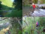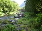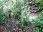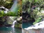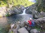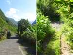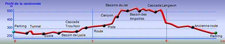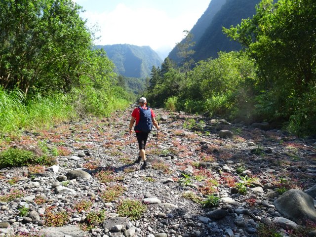 Inutile de tenter cette sortie un dimanche où les berges de la Rivière Langevin sont noires de monde. Il est impossible de stationner et difficile de photographier un bassin accueillant une dizaine de baigneurs. Évitons également de parler des déchets laissés là au bord de l'eau après le pique-nique ou la grillade ! En semaine, on a l'assurance de marcher sereinement de bassins en cascades. Sur les 5 km de montée, les berges ou le fond de la ravine peuvent être pratiqués assez facilement. Lorsque la cascade est trop haute ou le bassin trop profond, un contournement s'impose. Ces contournements, faciles à trouver, empruntent presque tous de beaux sentiers en bon état. Dans le village, on est certain de pouvoir sortir de la rivière tous les 10 mètres, tant les accès y sont nombreux. Trois types de ravine : Beaucoup d'eau dans le village, un lit à sec en amont du trou Noir et de belles cascades aux alentours de la Cascade Langevin. On marche rarement dans l'eau. Le cheminement sur galets secs s'effectue très facilement. Les rochers, plus haut, sont souvent moussus et glissants ; il faut donc prendre garde à la chute. Plus on monte et plus les cascades se multiplient, attirant des équipes de canyonistes. A la condition de trouver le bon contournement, cette sortie est à la portée de presque tous les randonneurs épris d'aventure hors des sentiers classiques. Afin d'éviter la circulation, la partie de la route abandonnée entre les deux passerelles a été testée. La route disparait doucement mais on passe encore très bien sur la trace laissée dans la végétation par les propriétaires des vergers qui la bordent.