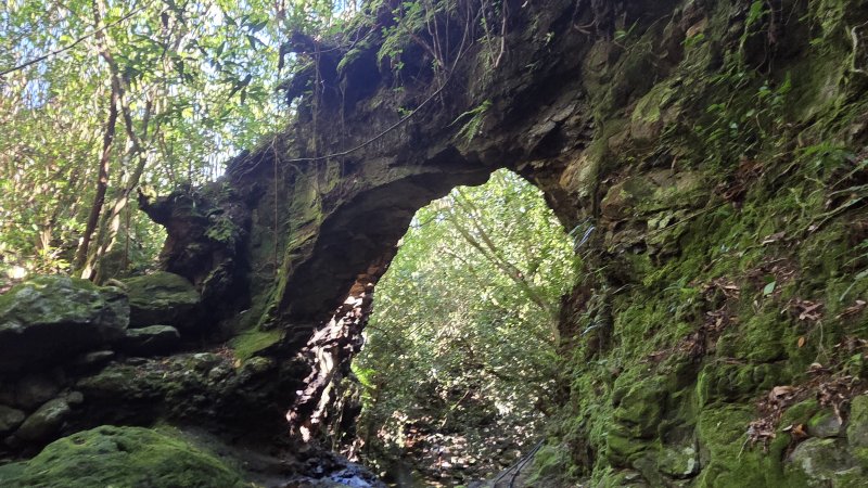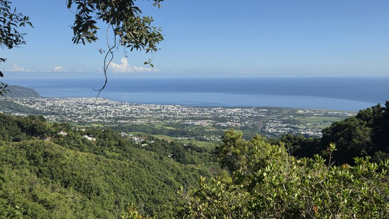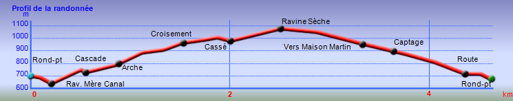 La randonnée débute sur le Chemin la Fleurette, au plus près d'une boucle de la route pour faire demi-tour, bien repérable sur la carte. La route se poursuit vers quelques habitations que l'on verra à la fin de la randonnée. Le sentier est très facile à repérer près de la vingtaine de boîtes aux lettres du village en amont (Photo 1). A peine franchis les premiers mètres, le sentier descend, parfois de manière abrupte, en direction du fond de la vallée de la Ravine Mère Canal. De solides rambardes en bois de goyavier permettent de se tenir pour éviter une glissade ou une chute (Photo 2). Cette descente amène à une première petite ravine qui coule à peine. Il faut passer sous de gros rochers avant d'en atteindre le lit (Photo 3). Les roches glissantes se traversent rapidement. On rejoint plus loin le fond de la Ravine Mère Canal. Le sentier continue mais se met à grimper très fortement sur de nombreuses marches en bois de goyavier (Photo 4). On retrouve les rambardes, très utiles pour se hisser vers l'avant tant la pente est forte (Photo 5). On rencontre un croisement. Le sentier de droite vient de l'Espérance les Hauts. Prendre à gauche puis continuer la montée en direction d'un banc sommaire pour souffler si nécessaire en admirant les panoramas sur Saint-Denis et Sainte-Marie (Photo 6). La pente n'est pas terminée pour autant (Photo 7), mais elle est beaucoup plus abordable que la précédente (Photo 8). Le sentier passe en ligne de crête entre les deux ravines. On entend couler la Ravine Mère Canal qui est proche sur la gauche. Ne pas manquer le petit sentier sur la gauche en direction d'un bassin. Même s'il y a peu d'eau, le lieu est agréable. Le fond basaltique accueille ce bassin alimenté par une petite cascade finissant sa course dans un trou de la roche (Photo 9). Reprendre l'ascension de plus en plus facile entre rambardes et végétation assez courte (Photo 10). En se retournant, on peut à tout moment apercevoir la côte et la ville blanche du chef-lieu (Photo 11). On parvient plus haut au bassin de l'arche désormais mieux connu depuis la parution de la randonnée 1541. Descendre jusqu'au petit bassin et sa cascade tout aussi modeste. Il est difficile de repérer l'arche qui domine la cascade (Photo 12). Le sentier se poursuit en rive droite mais il est plus intéressant de se rapprocher de l'arche en faisant demi-tour jusqu'au petit sentier qui passe sur l'arche. Il est plus étroit car créé par les curieux et se rapproche de la ravine. Prendre n'importe quelle trace à droite pour atteindre le trou dans la falaise (Photo 13). Continuer en marchant sur l'arche étroite pour arriver dans une aire envahie de cannes fourragères. Passer entre deux filaos puis bifurquer à droite pour entamer une montée vers Maison Martin sur un sentier très bien entretenu. Le fil d'Ariane, une grosse canalisation, monte en même temps que le randonneur sur une pente beaucoup plus raisonnable (Photo 14). Les goyaviers sont les rois des sous-bois. Quelques gros arbres subsistent et les bois de perroquets ou de violon tentent de garder assez de lumière pour survivre. La montée dure moins de 30 minutes, toujours le long de la ou des canalisations entrecoupées d'ouvrages bétonnés en direction du captage. Le sentier coupe la Ravine Mère Canal sur la digue étroite du bassin (Photo 15). Quand l'eau est plus abondante, il est obligatoire de mouiller les chaussures. On retrouve pour un temps un sentier pentu du style de celui de l’Échelle où les rambardes aident à l'ascension (Photo 16). Continuer jusqu'à la première intersection au milieu des goyaviers. Prendre à droite le sentier plus étroit mais bien visible (Photo 17). On n'imagine pas depuis le sentier principal que ce dernier est si bien aménagé même si des travaux récents y sont rares. Outre les habituelles marches et rambardes, on traverse des pontons sur les petites ravines (Photo 18). Traverser la Ravine du Coteau Rouge puis délaisser un ancien sentier partant sur la gauche, d'ailleurs devenu presque invisible. Redescendre ensuite vers la Ravine Sèche à 10 m d'un profond cassé d'où l'on a de belles vues sur la forêt et la côte (Photo 19). Il est facile de repérer la suite du sentier quand on voit l'escalier qui en escalade la rive (Photo 20). 150 m plus loin, un nouvel embranchement se présente. Prendre à gauche et partir plein sud (Photo 21). On est désormais habitué aux grimpettes en escaliers (Photo 22) ou aux descentes glissantes (Photo 23). Heureusement, des portions plus planes permettent de souffler un peu entre les goyaviers et plus loin les branles verts (Photo 24). On retrouve la Ravine Sèche qui se traverse à deux pas du Bassin Rond. Modeste quand le débit est faible, il peut être plus difficile à traverser après de fortes pluies (Photo 25). La boucle se poursuit, toujours dans la même végétation, jusqu'à la Ravine du Coteau Rouge puis au sentier quitté une heure auparavant. Aux alentours de Maison Martin, c’est une véritable piste tondue à ras (Photo 26). On retrouve plus bas la tuyauterie et ses ouvrages sur un sentier devenu plus étroit (Photo 27) ainsi que la portion déjà employée en montée. En arrivant aux alentours de l'arche déjà observée en montant, continuer tout droit pour arriver rapidement au Chemin la Fleurette desservant les dernières maisons de la Confiance les Hauts. Partir sur la gauche et suivre moins de 500 m de ce tronçon étroit bétonné, assez calme, jusqu'au point de départ (Photo 28).