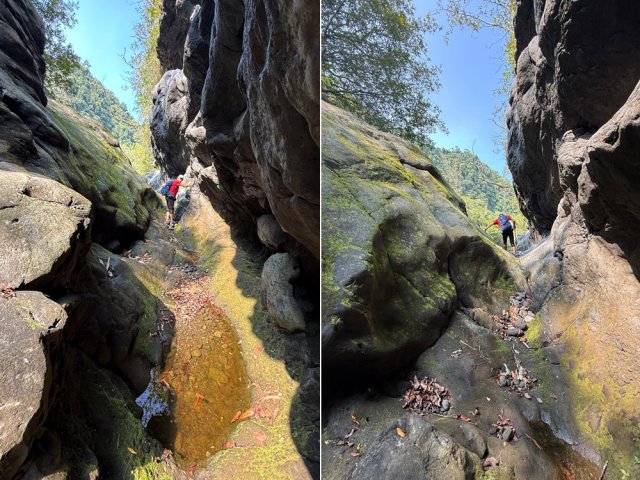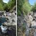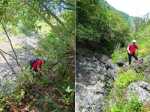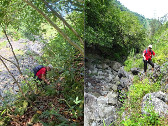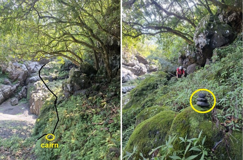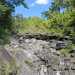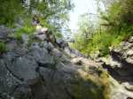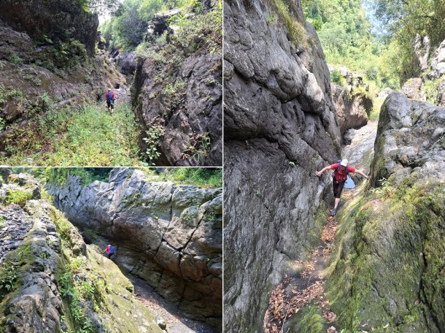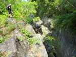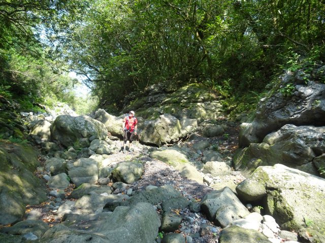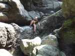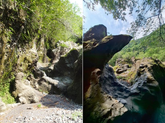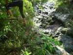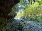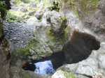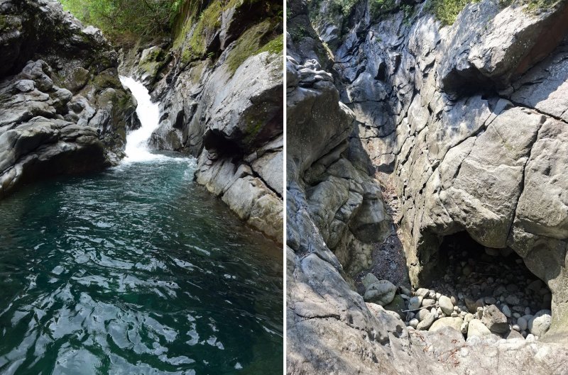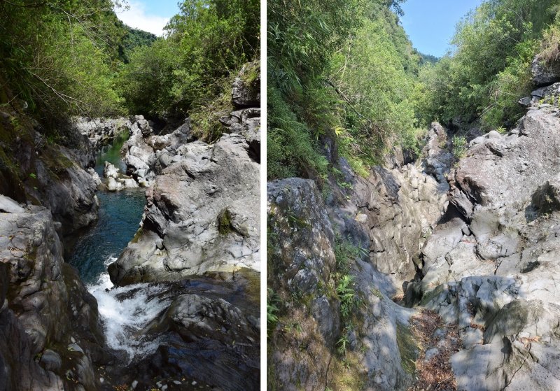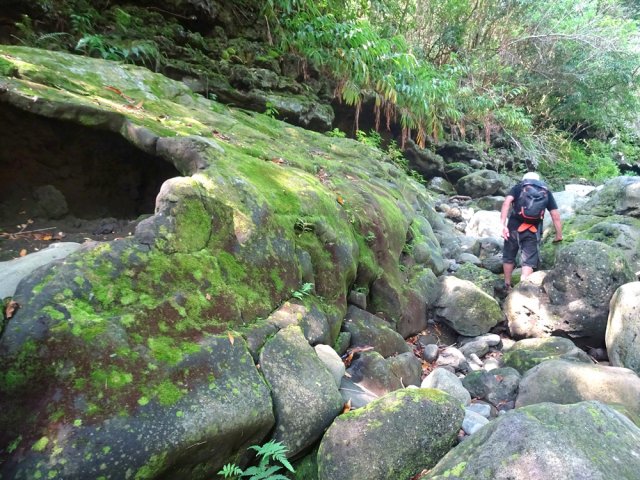 La randonnée débute ici sur l'ancienne route de Grand Galet, au plus près de la rivière. Se rapprocher de la rivière et marcher vers le barrage pour en étudier le fonctionnement. L'eau bifurque en rive gauche et se dirige vers le tunnel alimentant l'usine hydroélectrique. Repérer au passage le niveau de l'eau lors de certains cyclones dévastateurs (Photo 1). S'il y a beaucoup de débit, une partie de l'eau descend le lit qui, sinon devient sec car la priorité est donnée à l'usine. Depuis la digue, on peut voir immédiatement la différence (Photo 2). D'un côté l'eau limpide, de l'autre les flaques laissées par les pluies. C'est donc sur les éternels galets que débute cette randonnée. Le lit étant assez tourmenté, on y trouve des galets allant du ballon de rugby à la taille d'une voiture. Certains îlots rocheux n'ont pas encore pu être érodés (Photo 3). On croise des bassins sans fond, des roches, des cassés facilement franchissables (Photo 4). En grimpant le fossé en rive droite on arrive dans une longue faille à une dizaine de mètres de la rivière. On ne la voit pas en raison de la hauteur des murs moussus (Photo 5). La végétation des abords est principalement constituée de goyaviers et jamrosats créant des tunnels sombres (Photo 6). Les grottes, bouches de tunnel ou fissures ne sont pas en reste pour varier les paysages (Photo 7). Le premier grand bassin comporte des parties glissantes mais se contourne facilement. 100 m plus loin, on retrouve le fond rocheux. La marche est moins rapide que dans la faille mais il n'est pas toujours facile de traverser les fourrés et taillis (Photo 8). Un nouveau cassé précédé d'un étroit canyon se présente plus bas. C'est le grand bassin des Hirondelles. Avant de le traverser, remonter assez aisément les roches en rive gauche et marcher jusqu'aux cordes installées par les canyonistes pour effectuer une sortie quand il y a de l'eau. Attention à la descente glissante au retour (Photo 9). La descente du cassé commence par le canyon glissant où il est impératif de se tenir à la paroi (Photo 10). Une courte escalade en fin de canyon amène à un premier palier (Photo 11). Là aussi, la mousse impose de prendre son temps et de bien se maintenir à la roche (Photo 12). Il vaut mieux ne pas souffrir de vertige pour certains contournements (Photo 13). Ne pas chercher à descendre immédiatement au fond du bassin mais longer la falaise en rive gauche en passant près d'un magnifique affouche aux très longues racines. Une fois au fond on peut voir les hirondelles sortant de la grande grotte de l'autre côté (Photo 14). 5 minutes plus tard, on parvient à un nouveau cassé très facile à longer sans crainte (Photo 15). A nouveau, 5 minutes plus tard, on arrive au plus important bassin de la sortie, le Bassin à Jules. Impossible de descendre au fond immédiatement. Il faudra attendre d'être plus loin. Il est facile d'en suivre le haut sur les rochers assez stables (Photo 16). En restant toujours en rive gauche, on parvient là aussi aux câbles laissés par les professionnels pour descendre vers le Pont Babet (Photo 17). De cet endroit, on envie les sportifs qui finiront leur descente dans le Bassin à Jules, très profond, qu'il soit plein ou vide (Photo 18). Revenir sur ses pas de quelques mètres et trouver le long de la paroi des faiblesses permettant d'atteindre le fond du bassin qui domine celui à Jules. Une fois dans le canyon, on se régale du spectacle des parois, des interminables racines de Monstera délicieux, de la grotte du fond et du calme des lieux (Photo 19). Après une dernière photo depuis la grotte (Photo 20), revenir au point de faiblesse dominant le Bassin à Jules et remonter en rive gauche. Impossible de poursuivre sans cordes, aussi, reprendre le chemin inverse le long de la profonde faille (Photo 21). Remonter la rivière à sec et tenter de varier les paysages rencontrés lors de la descente. On retrouve les grosses roches bordées de jamrosats (Photo 22). On retrouve également des contournements sur les rives si l'on ne désire pas reprendre le fond de la rivière (Photo 23). Heureusement, pas de vigne marronne ou de galaberts qui pourraient abîmer les pieds (Photo 24) !! Les passages délicats délaissés dans la descente peuvent désormais se remonter plus sereinement en se méfiant tout de même de la mousse omniprésente (Photo 25). En délaissant la faille de contournement, on peut ainsi profiter de nouveaux paysages et de nouveaux canyons ou grottes. L'une d'entre elles est particulièrement profonde et dangereuse, imposant de retrouver les goyaviers pour un temps (Photo 26). C'est ainsi qu'on rencontre à nouveau le cassé présenté plus haut et évité par sécurité, car en descente. On peut ainsi repérer une ancienne arche, brisée par les éléments (Photo 27). Plus haut, un nouveau bassin doit se contourner (Photo 28) mais la petite route qui longe le réservoir de l'usine est proche et il est préférable de s'y rendre pour éviter de reprendre le lit de la rivière jusqu'au barrage. Il est facile de repérer des passages permettant de grimper le talus et se rapprocher de la haute grille. Prendre à gauche en direction de la Passerelle. Longer le long bassin, laisser l'école en ruine, puis traverser la passerelle sur la partie piéton avant d'emprunter l'ancienne route jusqu'au véhicule laissé en rive droite.